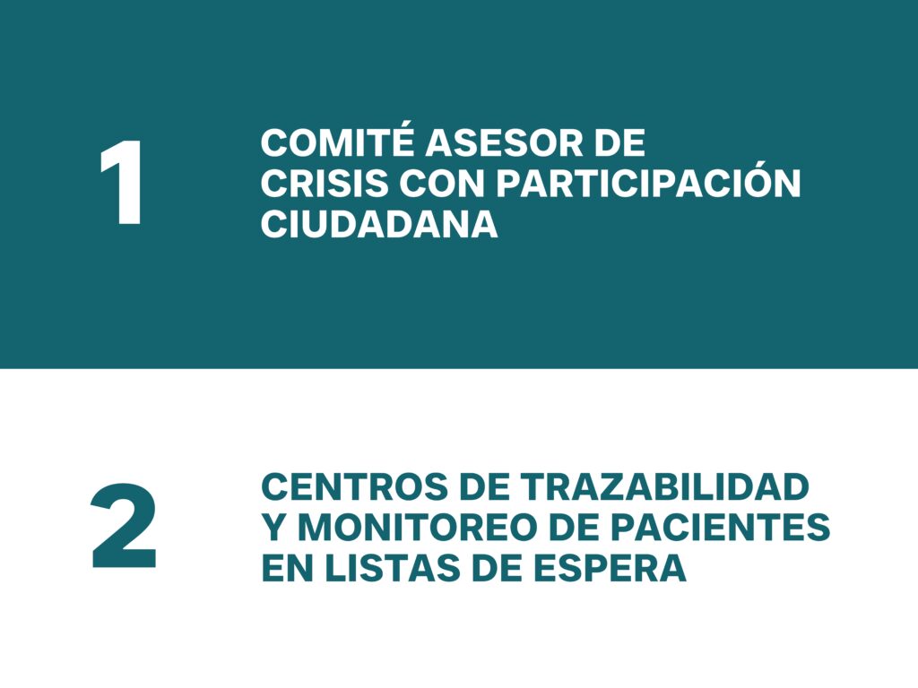 Comité Asesor de Crisis con Participación Ciudadana, de carácter transitorio, que incluya autoridades, expertos, pero sobre todo agrupaciones. Una de las principales conclusiones de este grupo de expertos es que Chile debe comenzar con un trabajo de participación social sistemático, en el área de salud, para la toma de decisiones. La importancia de la ciudadanía es fundamental, ya que permite identificar problemáticas en los procesos de salud y en la ruta del paciente, aspectos esenciales para garantizar la entrega de atención. Precisamente su rol es sesionar de manera periódica como un comité de crisis, para orientarlas acciones relativas a la gestión de la lista de espera y supervisar el cumplimiento de los compromisos tomados.