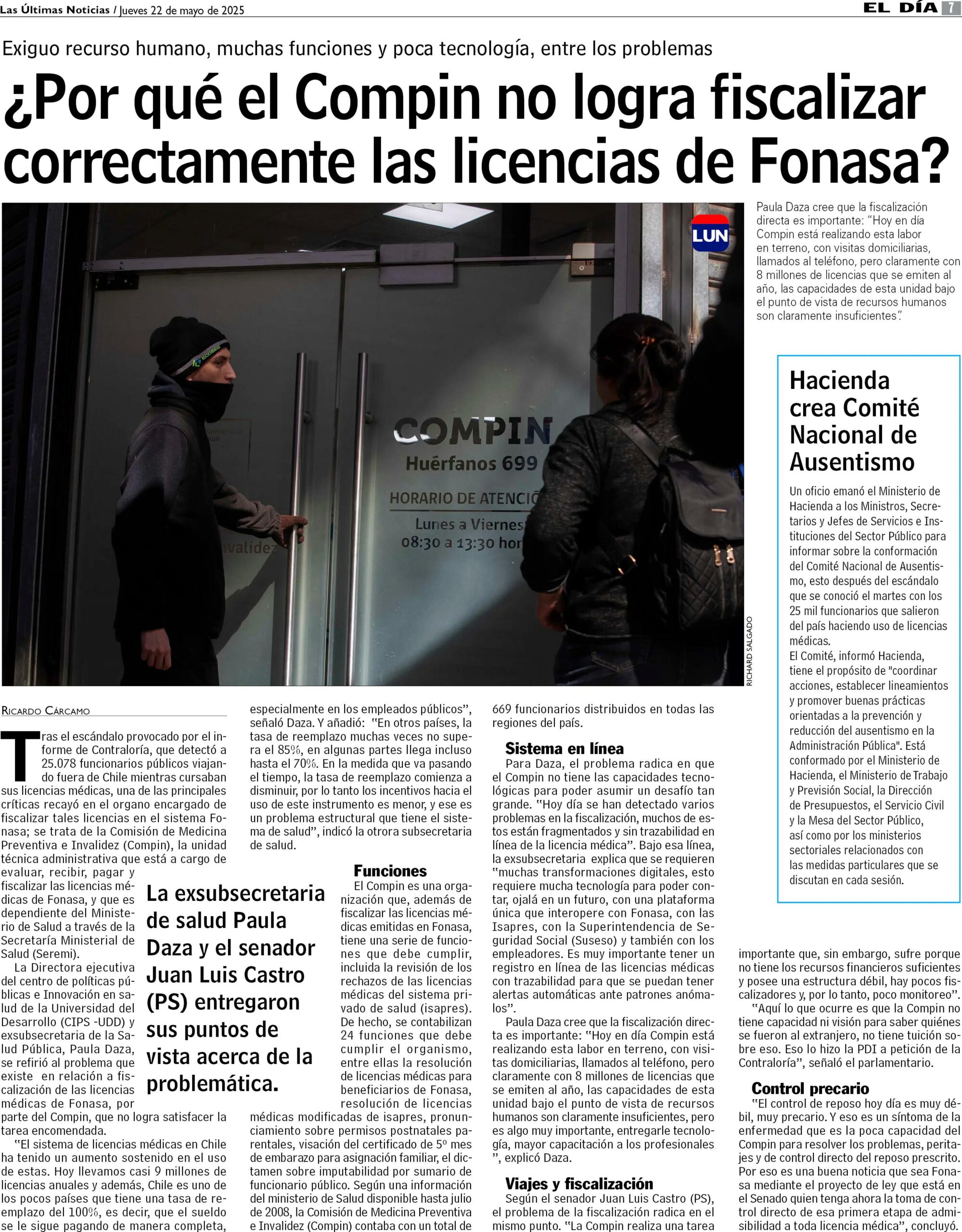 La Directora ejecutiva del CIPS UDD y exsubsecretaria de la Salud Pública, Paula Daza, se refirió al problema que existe en relación a fiscalización de las licencias médicas de Fonasa, por parte del Compin, que no logra satisfacer la tarea encomendada.