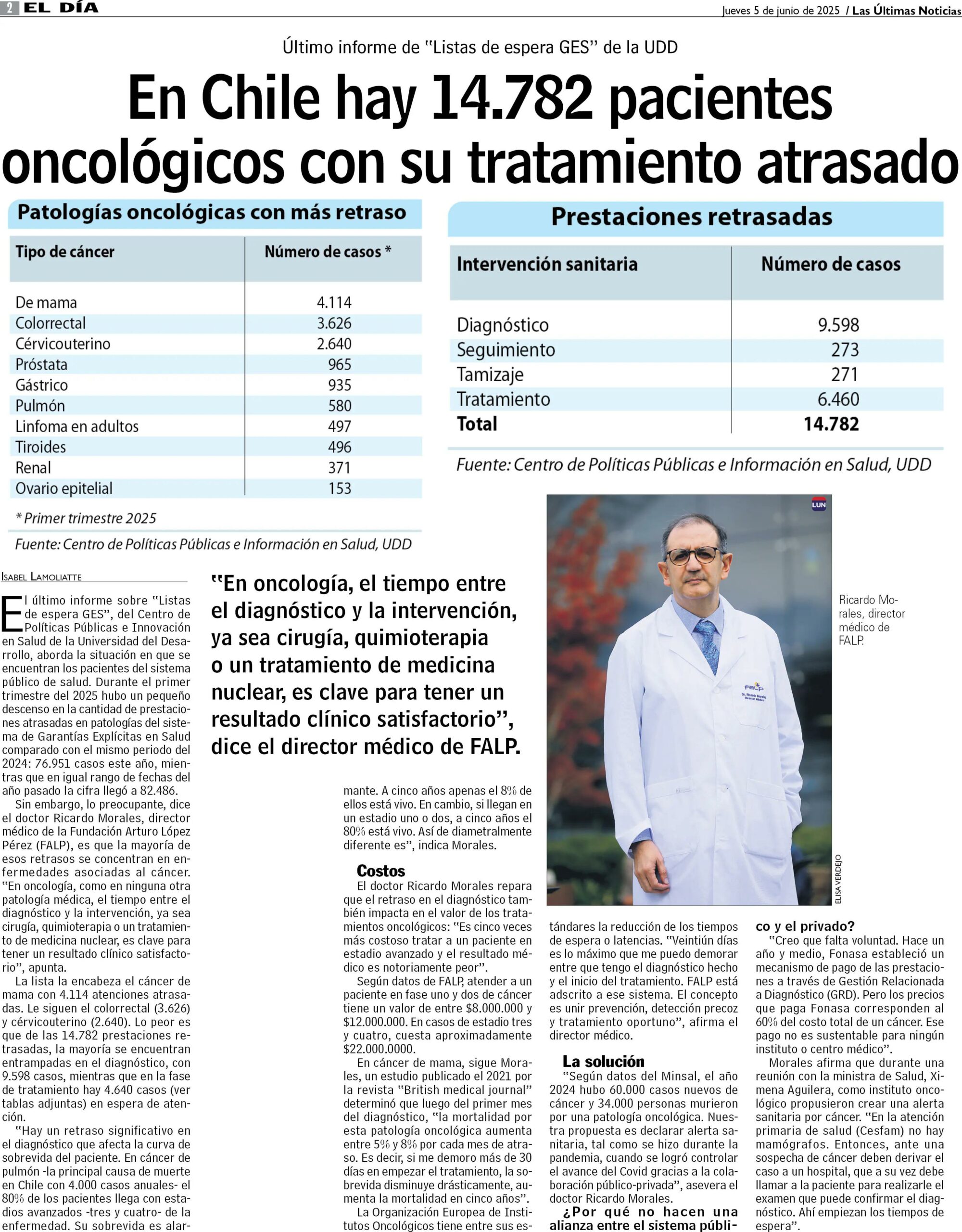 Sin embargo, lo preocupante, dice el doctor Ricardo Morales, director médico de la Fundación Arturo López Pérez (FALP), es que la mayoría de esos retrasos se concentran en enfermedades asociadas al cáncer. «En oncología, como en ninguna otra patología médica, el tiempo entre el diagnóstico y la intervención, ya sea cirugía, quimioterapia o un tratamiento de medicina nuclear, es clave para tener un resultado clínico satisfactorio», apunta.