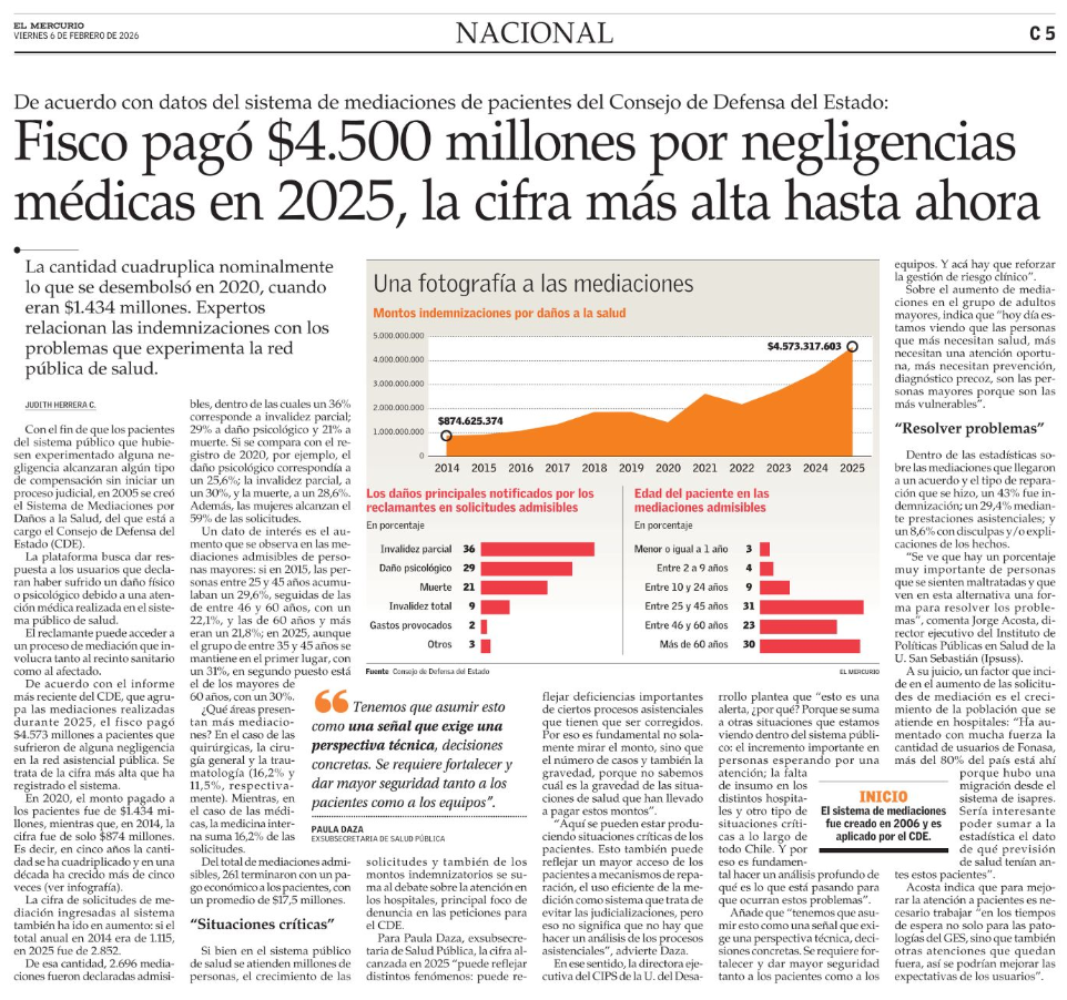 La directora ejecutiva de CIPS-UDD, Paula Daza, entregó declaraciones para El Mercurio sobre el histórico pago que realizó el Fisco por negligencias médicas en el 2025.
