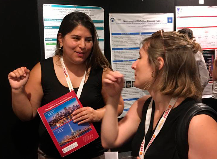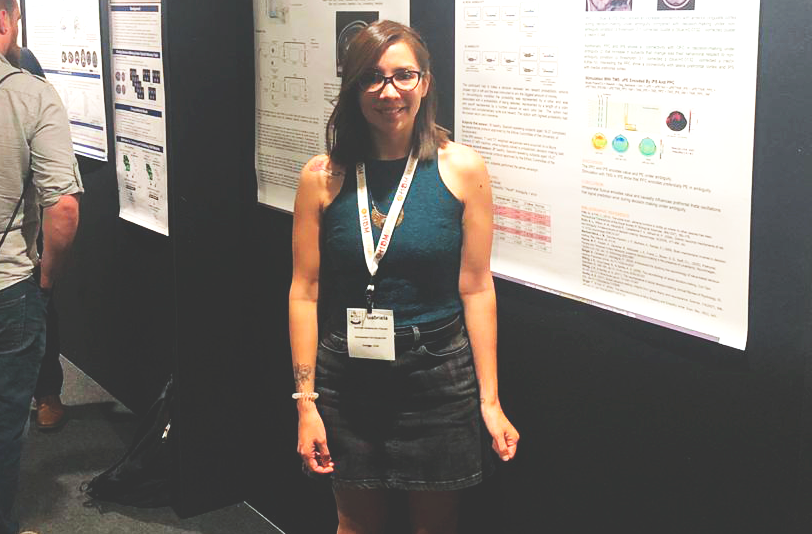 Fueron dos los trabajos presentados por Gabriela Valdebenito en la Reunión Anual de la Organización de este año; uno de ellos es el póster Posterior Parietal Cortex Encode Value and Prediction error in ambiguity decisions, que busca identificar el papel que cumple la corteza parietal en la actividad neurobiológica que codifica el valor, dado que la evidencia científica se centra tanto en la corteza prefrontal como en la parietal, pero el rol que cumple esta última aún no está claro. Es así que, tras la formulación de una hipótesis, la estudiante realizó estudios en más de 40 sujetos sanos utilizando, en un primer grupo, mediante resonancia magnética funcional (fMRI) y, en otros, mediante estimulación eléctrica transcraneal – electro encefalograma (TMS-EEG), arrojando resultados que demuestran un rol causal de la conectividad entre estas áreas cerebrales (prefrontal y corteza parietal) en la toma de decisiones bajo ambiguedad.
