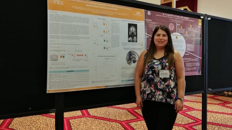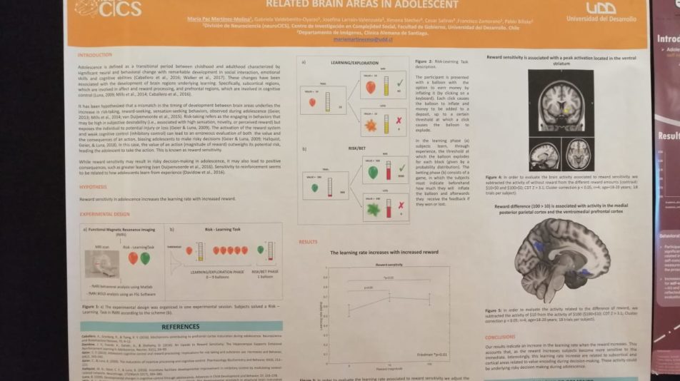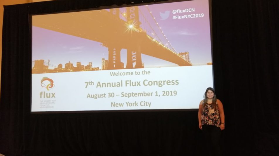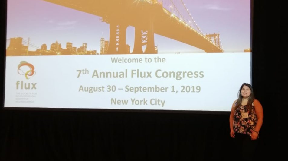 Más tarde, María Paz partió rumbo a Nueva York, para participar del Flux Congress del 30 de agosto hasta el 1 de septiembre, congreso organizado por la Flux Society para avanzar en la comprensión del desarrollo del cerebro humano; intercambiar información y educar a la próxima generación de investigadores de neurociencia cognitiva; compartir hallazgos de investigación científica que están disponibles sobre el desarrollo del cerebro; entre otros objetivos. En la ocasión, la estudiante del DCCS presentó su póster Reward magnitude increases learning rate and the activity in value-related brain areas in adolescents.