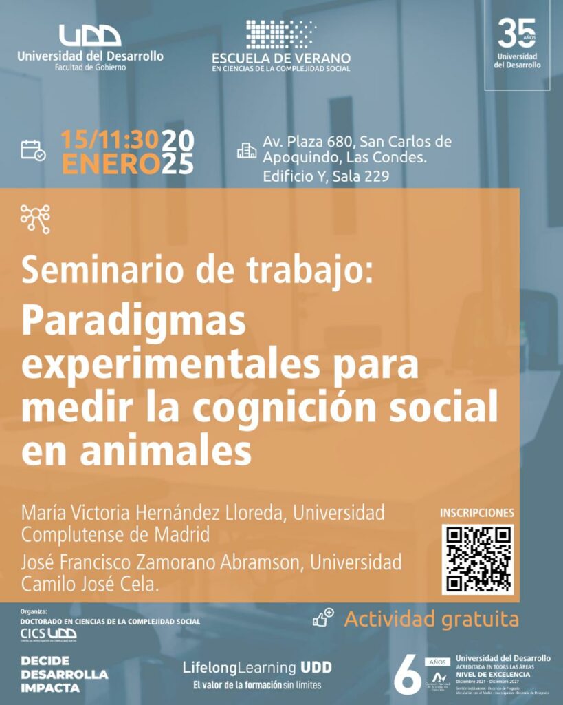 El próximo miércoles 15 de enero se realizará el Seminario Paradigmas experimentales para medir la cognición social en animales, organizado por el Doctorado en Ciencias de la Complejidad Social de la Facultad de Gobierno UDD.