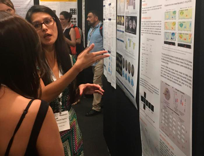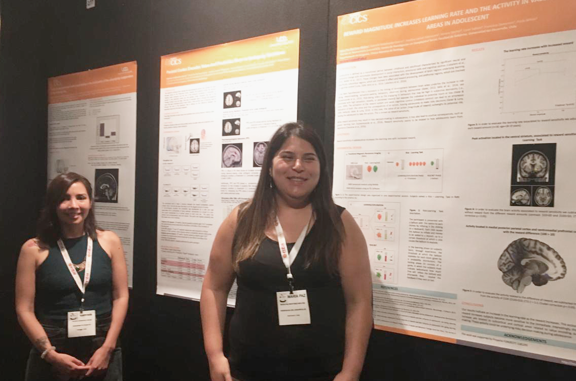 Por su parte, María Paz Martínez presentó el póster Reward magnitude increases learning rate and the activity in value-related brain areas in adolescent, cuyo trabajo investigativo trata acerca de la toma de decisiones arriesgadas durante la adolescencia, y cómo estas decisiones se asocian a una mayor sensibilidad a los incentivos y un control cognitivo relativamente débil. Tras el planteamiento de una hipótesis relacionada a la magnitud de la recompensa, los cambios en la tasa de aprendizaje y/o un sesgo (positivo o negativo) en la estimación del valor, se evaluaron las áreas cerebrales asociadas a la toma de decisiones arriesgadas en adolescentes sanos mientras realizan una tarea determinada.