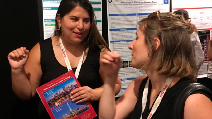 Fueron dos los trabajos presentados por Gabriela Valdebenito en la Reunión Anual de la Organización de este año; uno de ellos es el póster Posterior Parietal Cortex Encode Value and Prediction error in ambiguity decisions, que busca identificar el papel que cumple la corteza parietal en la actividad neurobiológica que codifica el valor, dado que la evidencia científica se centra tanto en la corteza prefrontal como en la parietal, pero el rol que cumple esta última aún no está claro. Es así que, tras la formulación de una hipótesis, la estudiante realizó estudios en más de 40 sujetos sanos utilizando, en un primer grupo, mediante resonancia magnética funcional (fMRI) y, en otros, mediante estimulación eléctrica transcraneal – electro encefalograma (TMS-EEG), arrojando resultados que demuestran un rol causal de la conectividad entre estas áreas cerebrales (prefrontal y corteza parietal) en la toma de decisiones bajo ambiguedad.