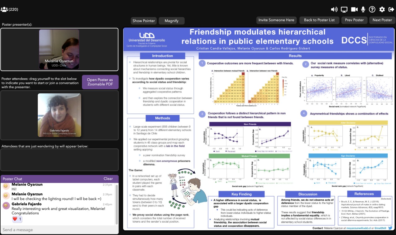Gabriela Fajardo, estudiante de la generación 2018, y Melanie Oyarzún, de la generación 2019, ambas del Doctorado en Ciencias de la Complejidad Social, participaron en la segunda jornada del HBES 2021, presentando los pósters Long-term mating orientation in men The role of socioeconomic status, protection skills and parental ability y Friendship modulates hierarchical relations in public elementary schools, respectivamente.