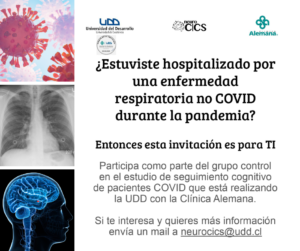El equipo del laboratorio NeuroCICS, junto a la Clínica Alemana, busca voluntarios que hayan sido hospitalizados durante la pandemia para el grupo control de estudio sobre consecuencias neurológicas del virus. Los participantes deberán asistir a dos sesiones de exámenes, por lo cual serán compensados económicamente.