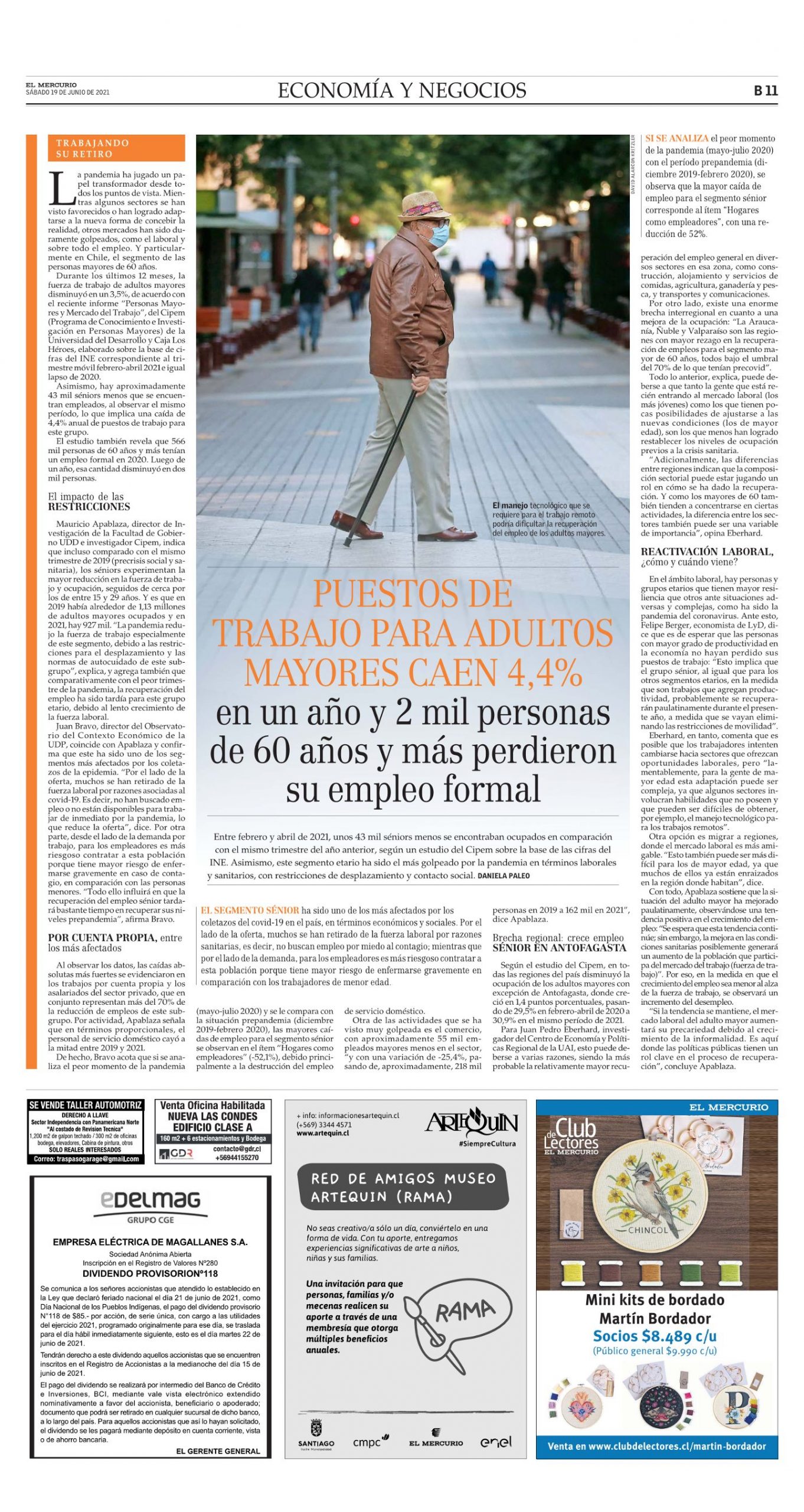 Durante los últimos 12 meses, la fuerza de trabajo de adultos mayores disminuyó en un 3,5%, de acuerdo con el reciente informe «Personas Mayores y Mercado del Trabajo», del Cipem (Programa de Conocimiento e Investigación en Personas Mayores) de la Universidad del Desarrollo y Caja Los Héroes, elaborado sobre la base de cifras del INE correspondiente al trimestre móvil febrero-abril 2021 e igual lapso de 2020.