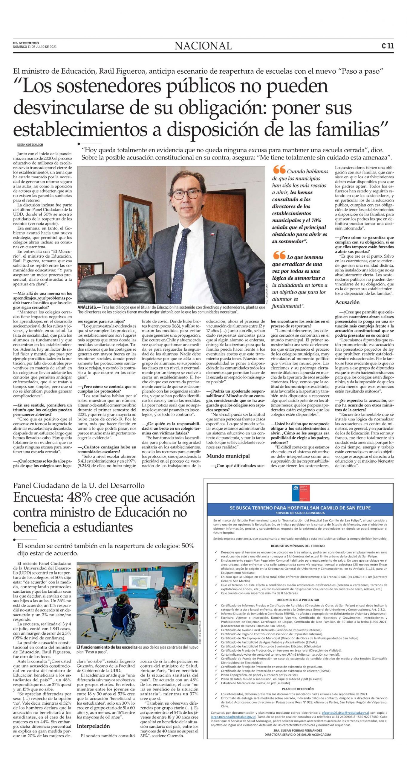 El reciente Panel Ciudadano de la Universidad del Desarrollo (UDD) se centró en la reapertura de los colegios: el 50% dijo estar “de acuerdo” con la medida, contemplando protocolos sanitarios y que las familias sean las que decidan si envían o no a sus hijos a las aulas. Un 36% no está de acuerdo; un 11% respondió no estar de acuerdo ni en desacuerdo y un 3% no sabe/no responde.