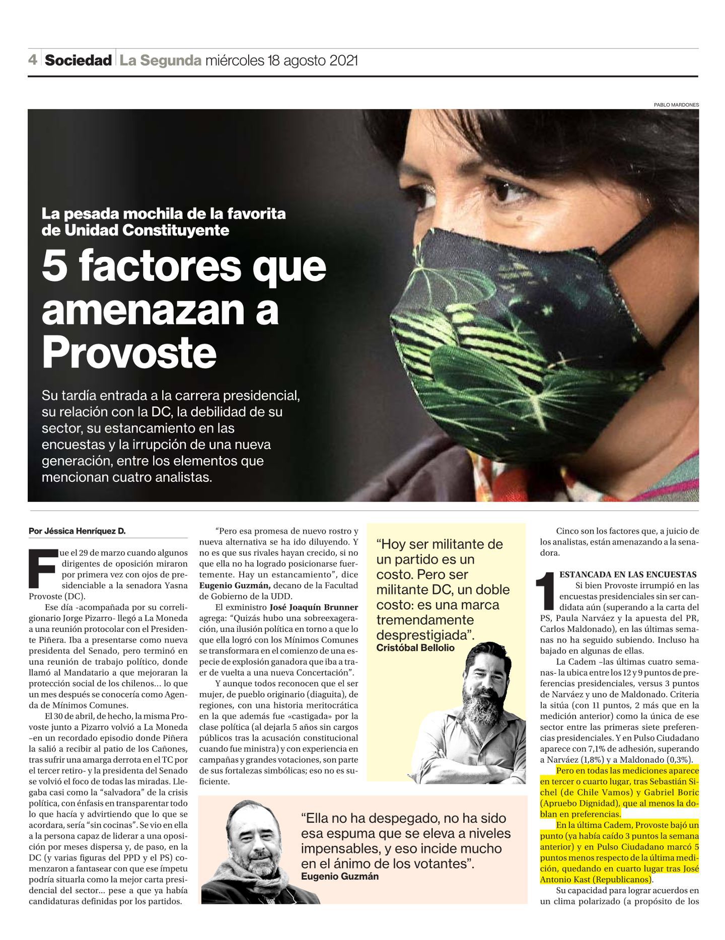 Pero en todas las mediciones aparece en tercer o cuarto lugar, tras Sebastián Sichel (de Chile Vamos) y Gabriel Boric (Apruebo Dignidad), que al menos la doblan en preferencias. En la última Cadem, Provoste bajó un punto (ya había caído 3 puntos la semana anterior) y en Pulso Ciudadano marcó 5 puntos menos respecto de la última medición, quedando en cuarto lugar tras José Antonio Kast (Republicanos). Su capacidad para lograr acuerdos en un clima polarizado (a propósito de los Mínimos Comunes) la catapultó en las encuestas, pero esa visibilidad mediática hoy la tiene la Convención Constitucional y la ha sacado de la escena pública.