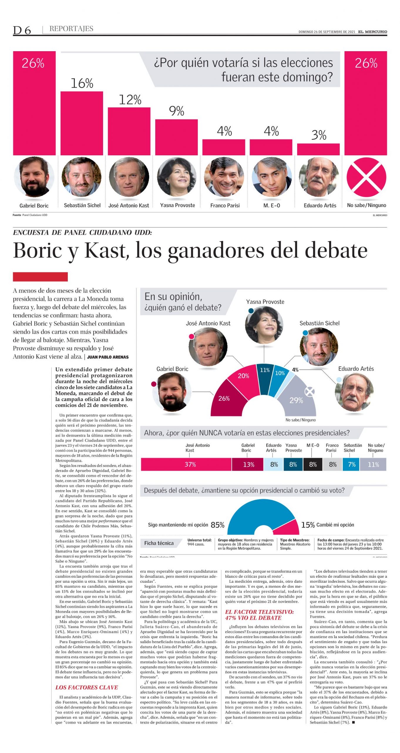 Al menos, así lo demuestra la última medición realizada por Panel Ciudadano UDD, entre el jueves 23 y el viernes 24 de septiembre, que contó con la participación de 944 personas, mayores de 18 años, residentes de la Región Metropolitana. Según los resultados del sondeo, el abanderado de Apruebo Dignidad, Gabriel Boric, se consolidó como el vencedor del debate, con un 26% de las preferencias, donde obtuvo un claro respaldo del grupo etario entre los 18 y 30 años (32%).