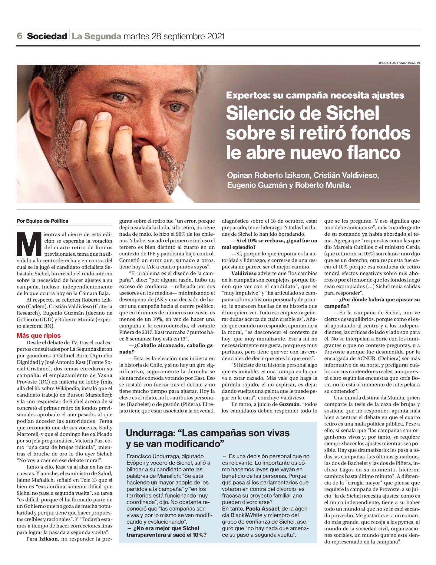 …En tanto, a juicio de Eugenio Guzmán, decano de la Facultad de Gobierno UDD, “todos los candidatos deben responder todo lo que se les pregunte. Y eso significa que uno debe anticiparse”, más cuando gente de su comando ya había abordado el tema. Agrega que “respuestas como las que dio Marcela Cubillos o el ministro Cerda (que retiraron su 10%) son claras: uno dijo que es un derecho, otra respuesta fue sacar el 10% porque esa conducta de retiro tendrá efectos negativos sobre mis ahorros o por el temor de que los fondos luego sean expropiados (…) Sichel tenía salidas para responder”.