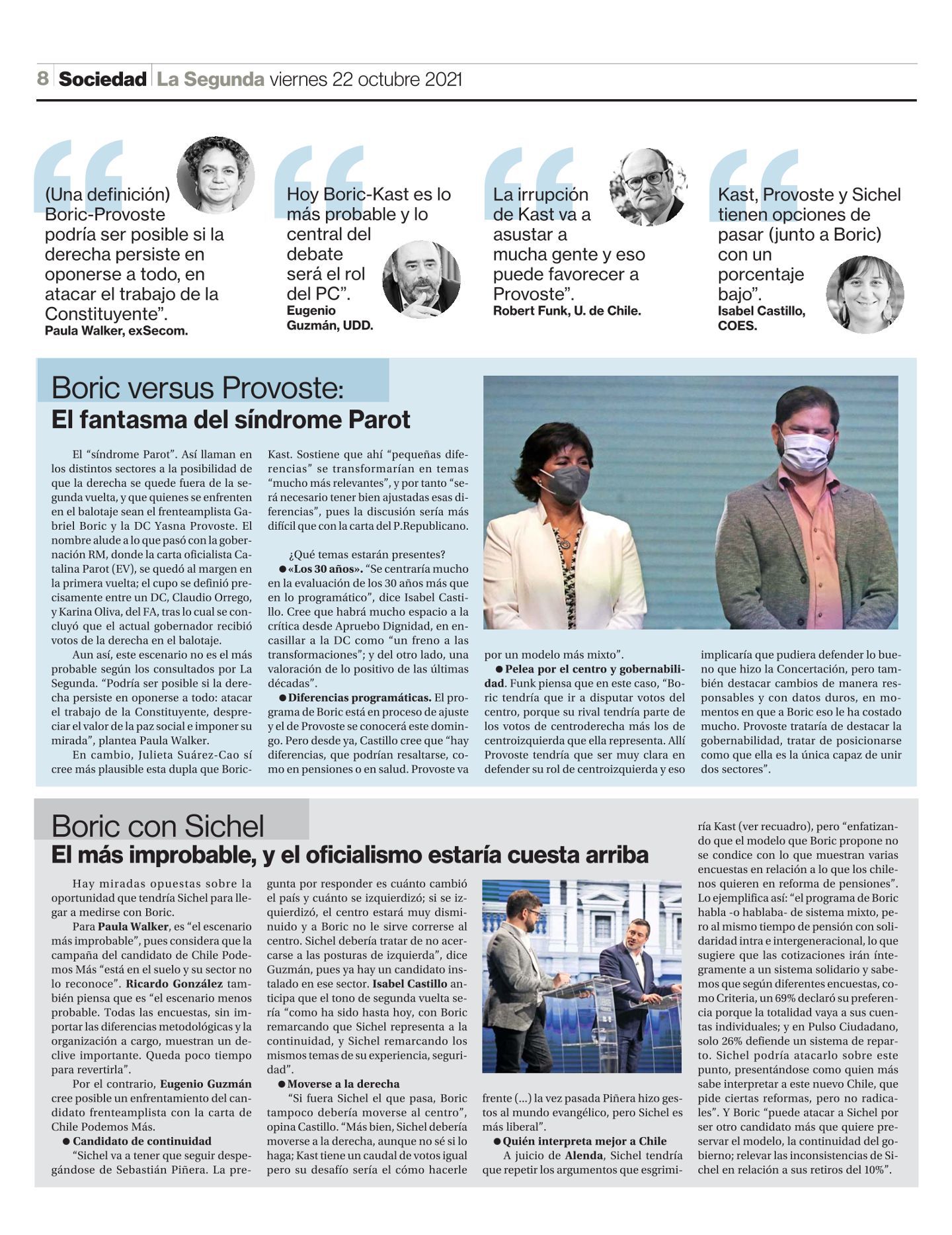 “Sichel va a tener que seguir despegándose de Sebastián Piñera. La pregunta por responder es cuánto cambió el país y cuánto se izquierdizó; si se izquierdizó, el centro estará muy disminuido y a Boric no le sirve correrse al centro. Sichel debería tratar de no acercarse a las posturas de izquierda”, dice Guzmán, pues ya hay un candidato instalado en ese sector. Isabel Castillo anticipa que el tono de segunda vuelta sería “como ha sido hasta hoy, con Boric remarcando que Sichel representa a la continuidad, y Sichel remarcando los mismos temas de su experiencia, seguridad”.