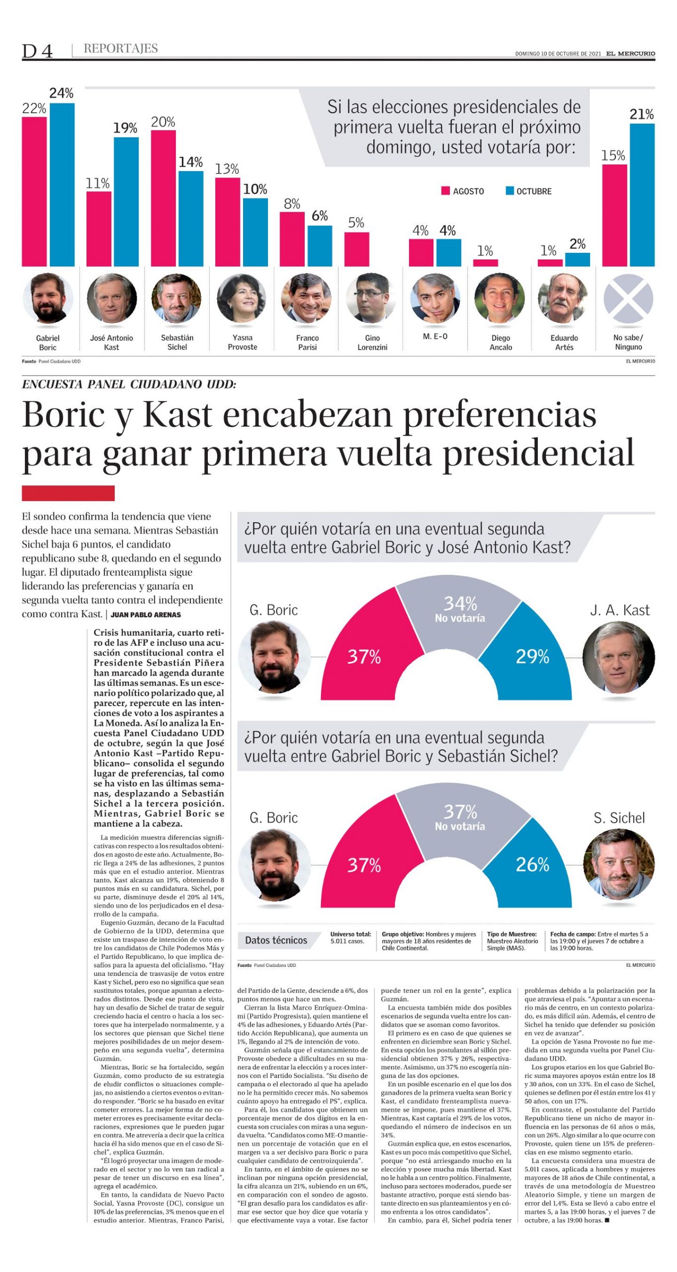 Así lo analiza la Encuesta Panel Ciudadano UDD de octubre, según la que José Antonio Kast –Partido Republicano– consolida el segundo lugar de preferencias, tal como se ha visto en las últimas semanas, desplazando a Sebastián Sichel a la tercera posición. Mientras, Gabriel Boric se mantiene a la cabeza.