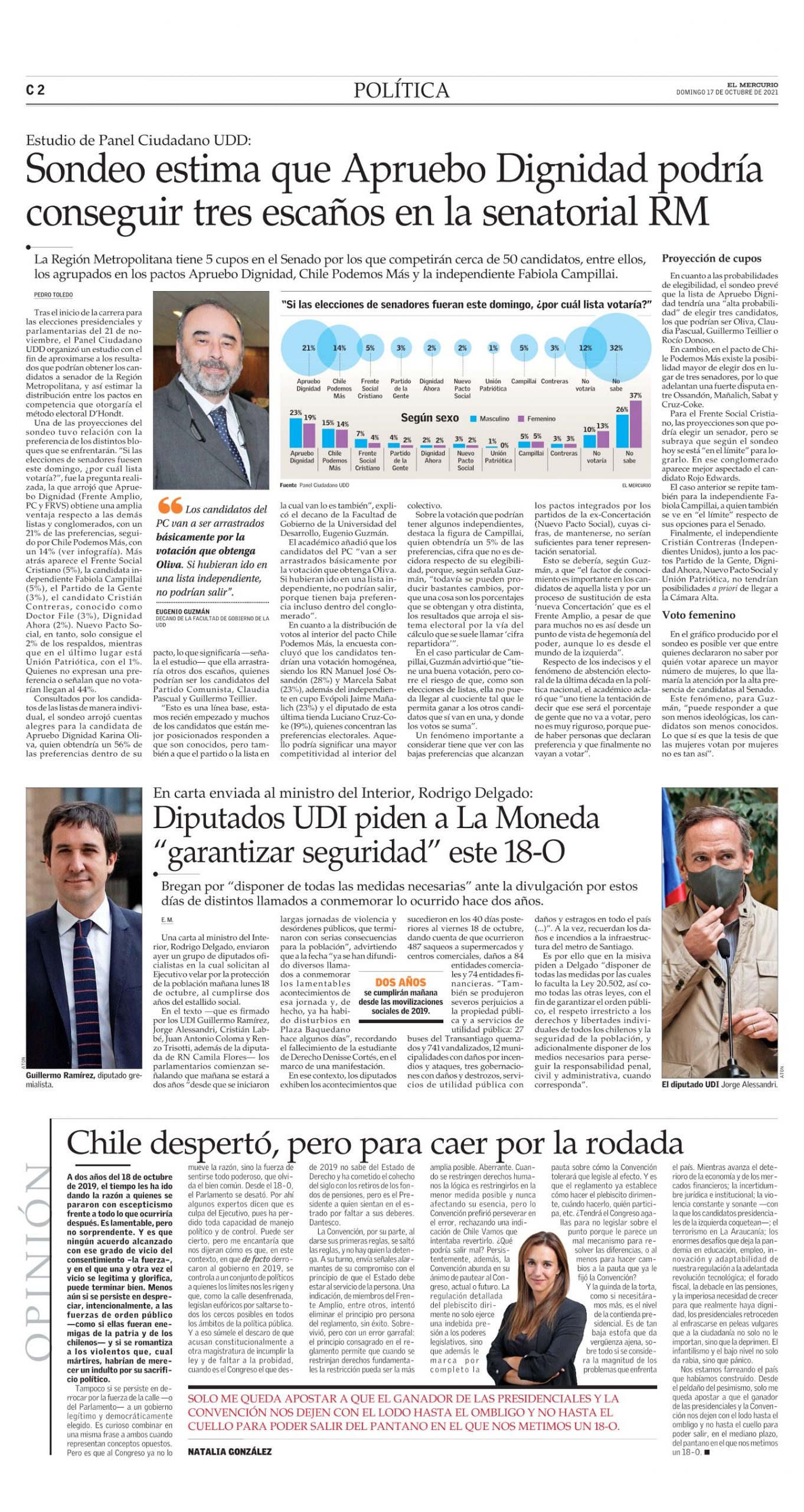 Tras el inicio de la carrera para las elecciones presidenciales y parlamentarias del 21 de noviembre, el Panel Ciudadano UDD organizó un estudio con el fin de aproximarse a los resultados que podrían obtener los candidatos a senador de la Región Metropolitana, y así estimar la distribución entre los pactos en competencia que otorgaría el método electoral D»Hondt.