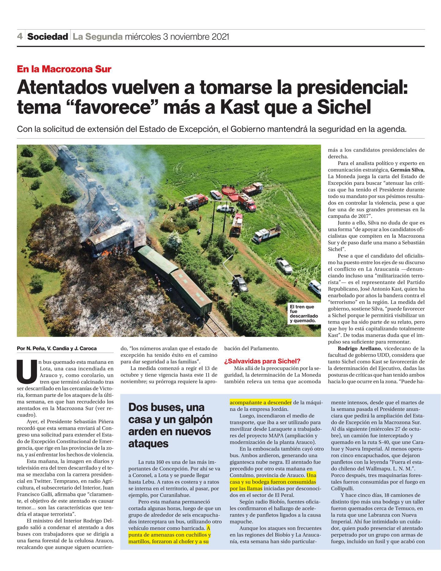 Un bus quemado esta mañana en Lota, una casa incendiada en Arauco y, como corolario, un tren que terminó calcinado tras ser descarrilado en las cercanías de Victoria, forman parte de los ataques de la última semana, en que han recrudecido los atentados en la Macrozona Sur (ver recuadro)…
