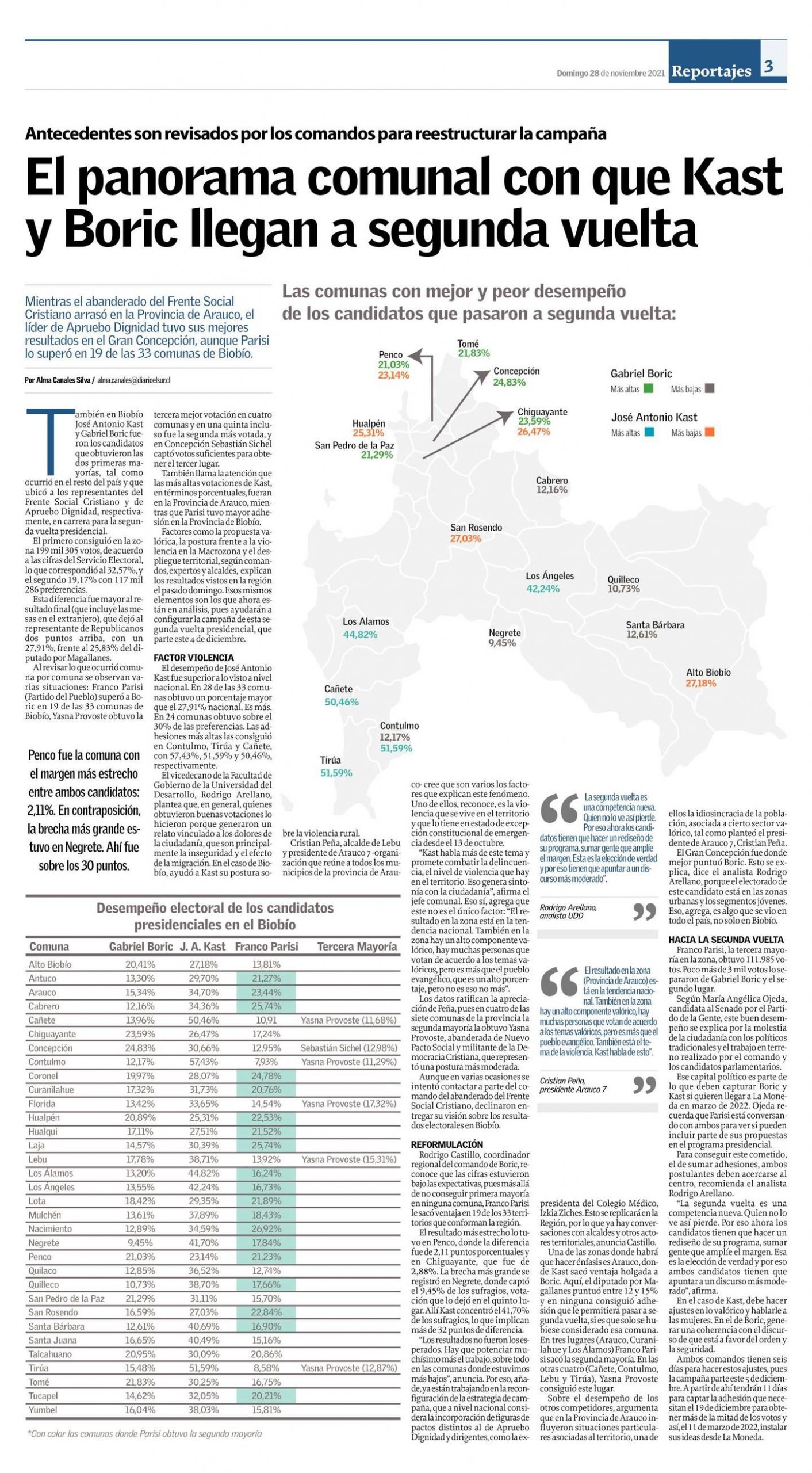 El vicedecano de la Facultad de Gobierno de la Universidad del Desarrollo, Rodrigo Arellano, plantea que, en general, quienes obtuvieron buenas votaciones lo hicieron porque generaron un relato vinculado a los dolores de la ciudadanía, que son principalmente la inseguridad y el efecto de la migración. En el caso de Biobío, ayudó a Kast su postura sobre la violencia rural.