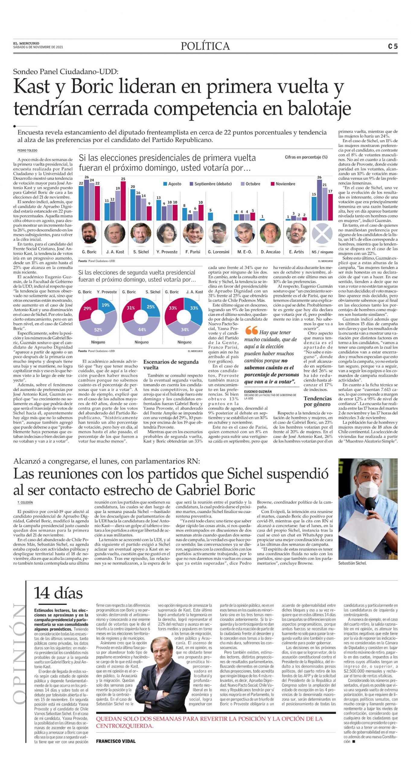 A poco más de dos semanas de la primera vuelta presidencial, la encuesta realizada por Panel Ciudadano y Universidad del Desarrollo mostró una tendencia de votación mayor para José Antonio Kast y un segundo puesto para Gabriel Boric de cara a las elecciones del 21 de noviembre.