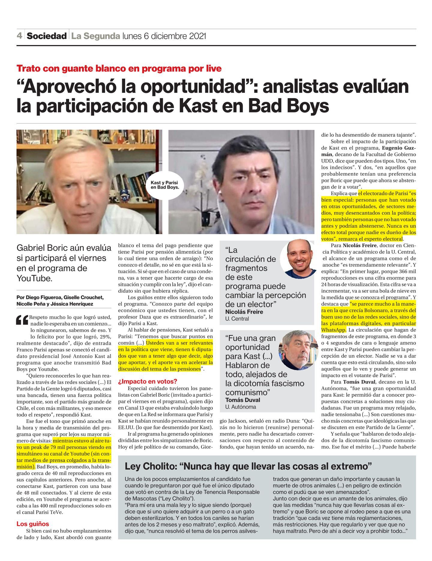 Sobre el impacto de la participación de Kast en el programa, Eugenio Guzmán, decano de la Facultad de Gobierno UDD, dice que pueden dos tipos. Uno, “en los indecisos”. Y dos, “en aquellos que probablemente tenían una preferencia por Boric que puede que ahora se abstengan de ir a votar”.