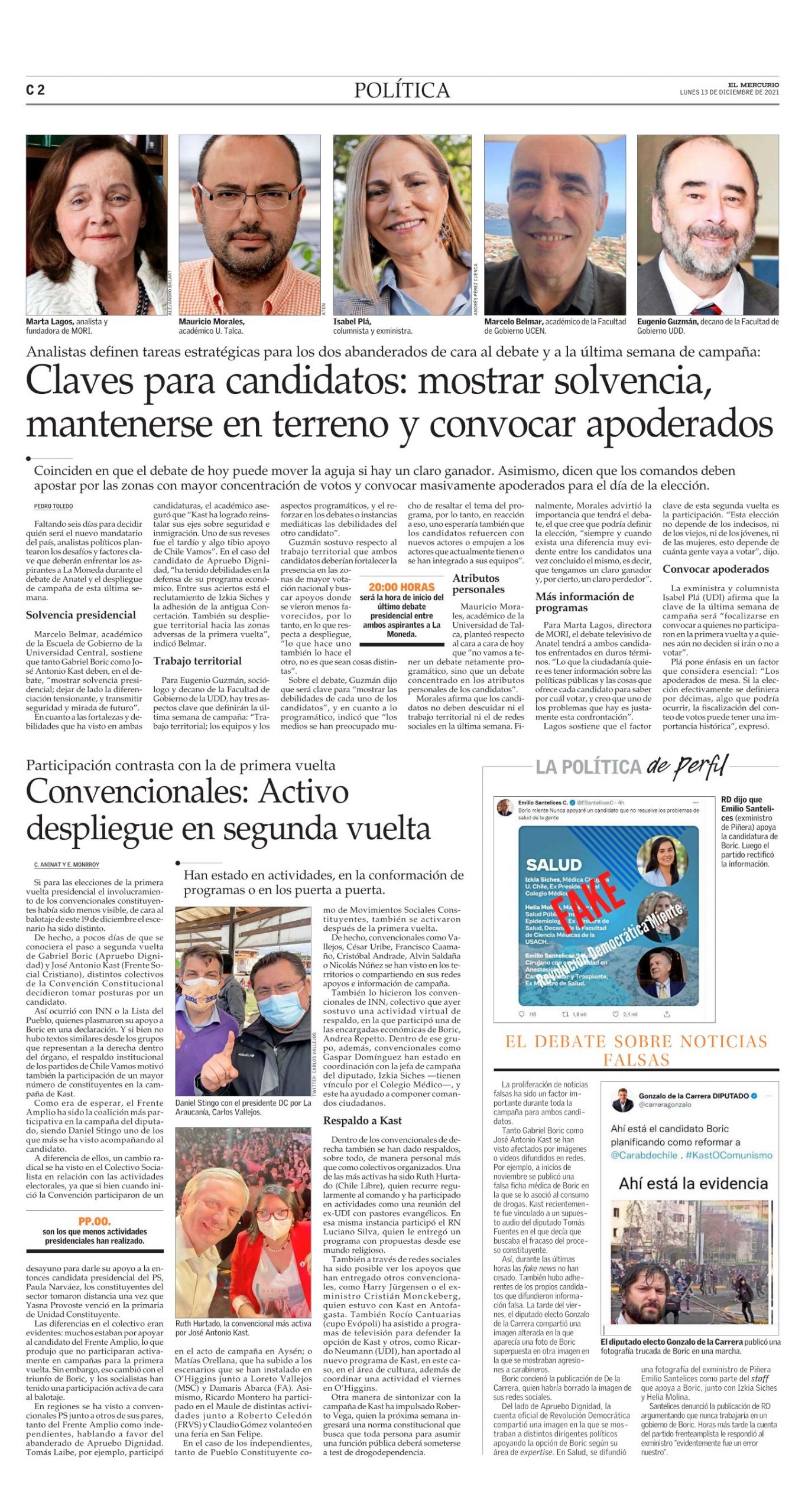 Para Eugenio Guzmán, sociólogo y decano de la Facultad de Gobierno de la UDD, hay tres aspectos clave que definirán la última semana de campaña: “Trabajo territorial; los equipos y los aspectos programáticos, y el reforzar en los debates o instancias mediáticas las debilidades del otro candidato”.