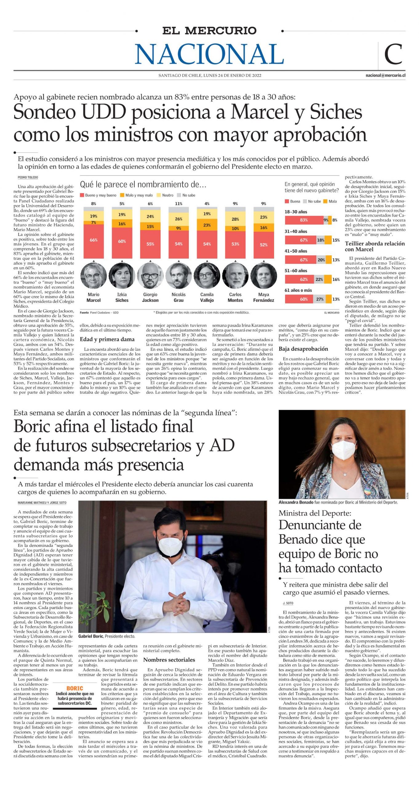 Una alta aprobación del gabinete presentado por Gabriel Boric fue la que percibió la encuesta Panel Ciudadano realizada por la Universidad del Desarrollo, donde un 69% de los encuestados catalogó al equipo de “bueno” y destacó la figura del futuro ministro de Hacienda, Mario Marcel.
