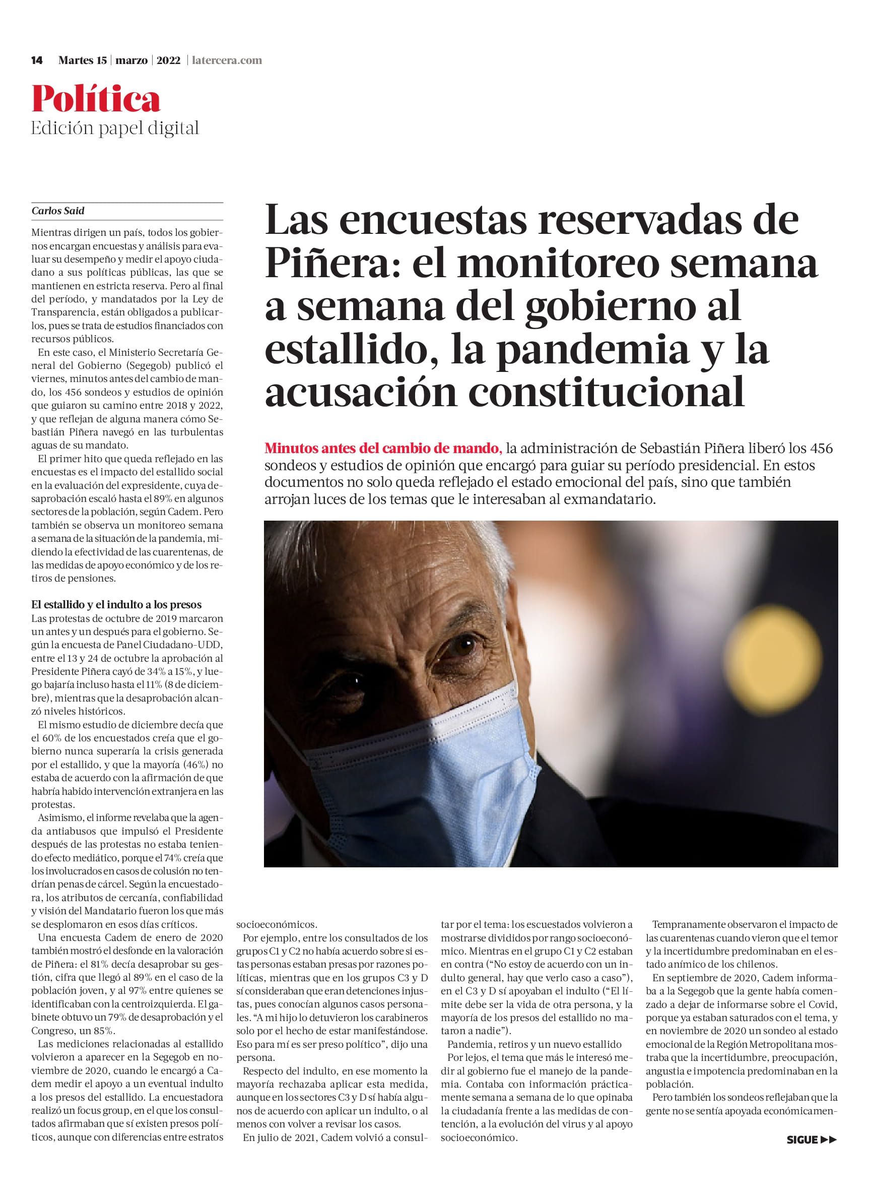 Minutos antes del cambio de mando, la administración de Sebastián Piñera liberó los 456 sondeos y estudios de opinión que encargó para guiar su período presidencial. En estos documentos no solo queda reflejado el estado emocional del país, sino que también arrojan luces de los temas que le interesaban al exmandatario.