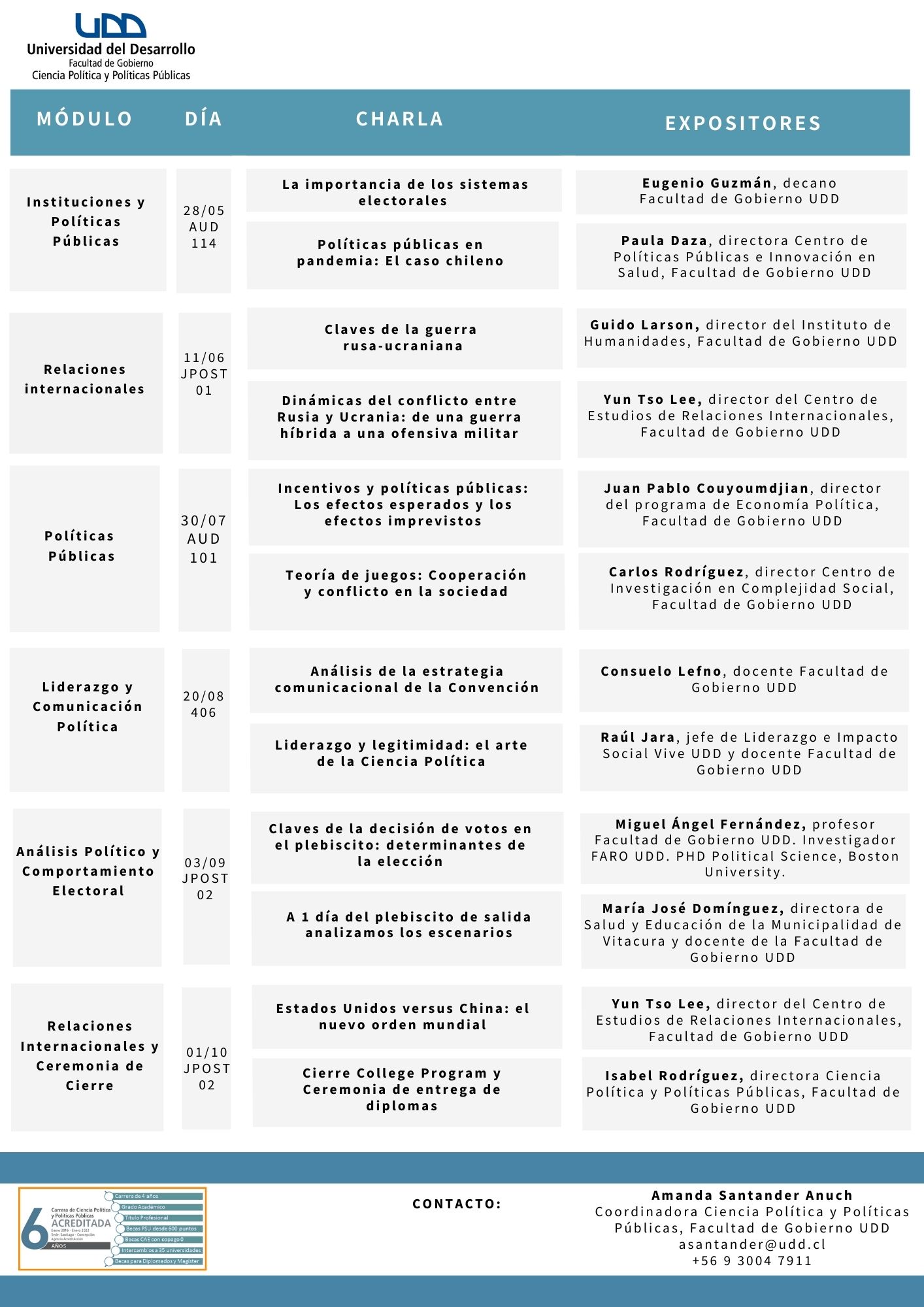 Análisis Político Electoral, Comunicación Política, Proceso Constituyente, Guerra entre Rusia y Ucrania, China y la Política Internacional, Políticas Públicas y Teoría de Juegos, son algunos de los temas que se abordarán.