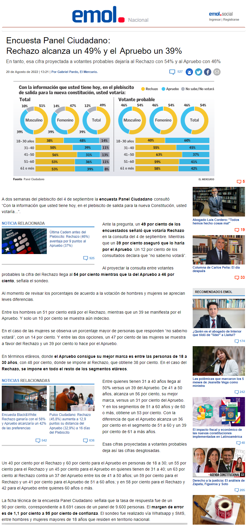 Panel Ciudadano: Rechazo alcanza un 49% y el Apruebo un 39%