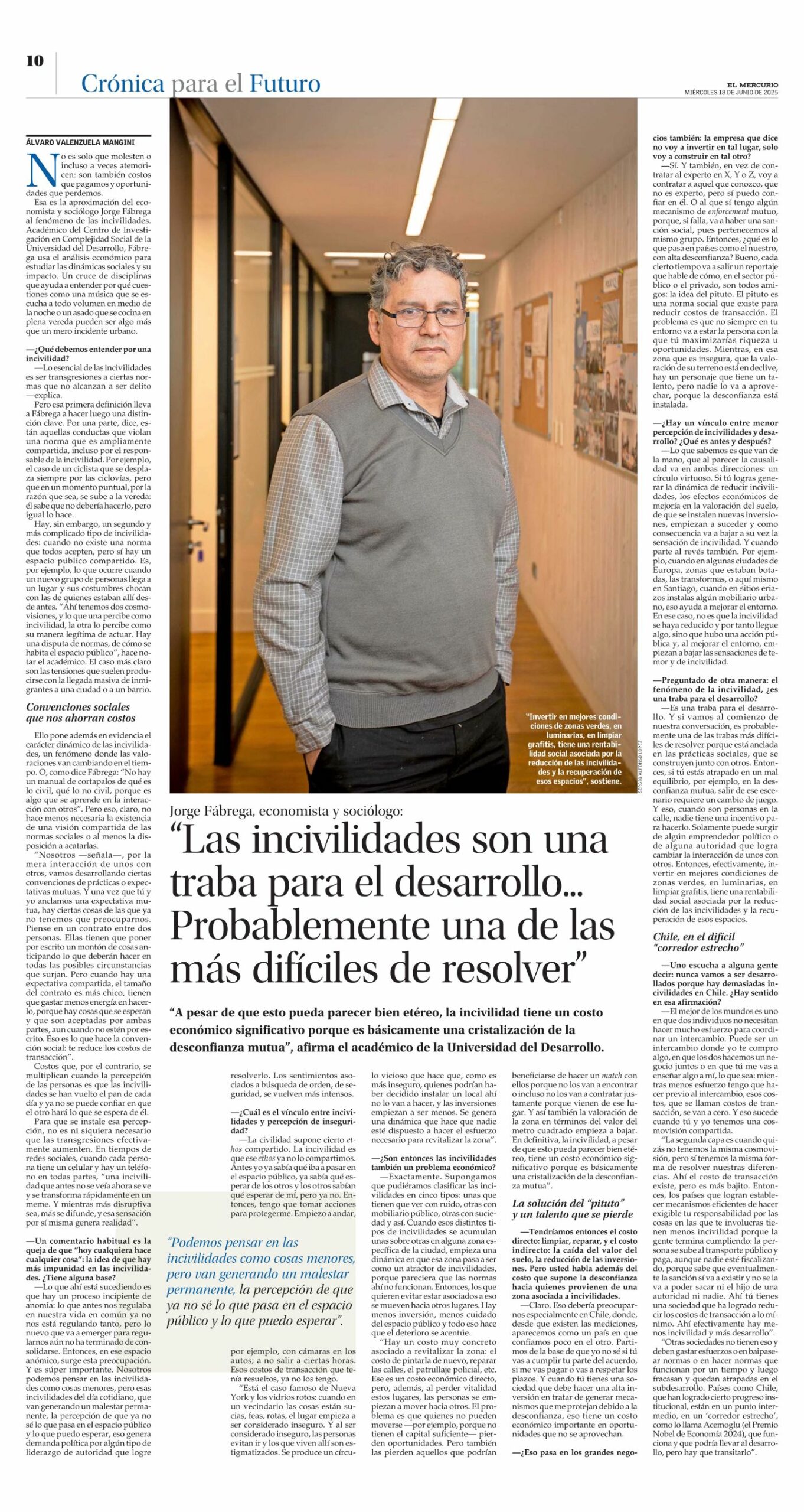 —Lo que sabemos es que van de la mano, que al parecer la causalidad va en ambas direcciones: un círculo virtuoso. Si tú logras generar la dinámica de reducir incivilidades, los efectos económicos de mejoría en la valoración del suelo, de que se instalen nuevas inversiones, empiezan a suceder y como consecuencia va a bajar a su vez la sensación de incivilidad. Y cuando parte al revés también. Por ejemplo, cuando en algunas ciudades de Europa, zonas que estaban botadas, las transformas, o aquí mismo en Santiago, cuando en sitios eriazos instalas algún mobiliario urbano, eso ayuda a mejorar el entorno. En ese caso, no es que la incivilidad se haya reducido y por tanto llegue algo, sino que hubo una acción pública y, al mejorar el entorno, empiezan a bajar las sensaciones de temor y de incivilidad.