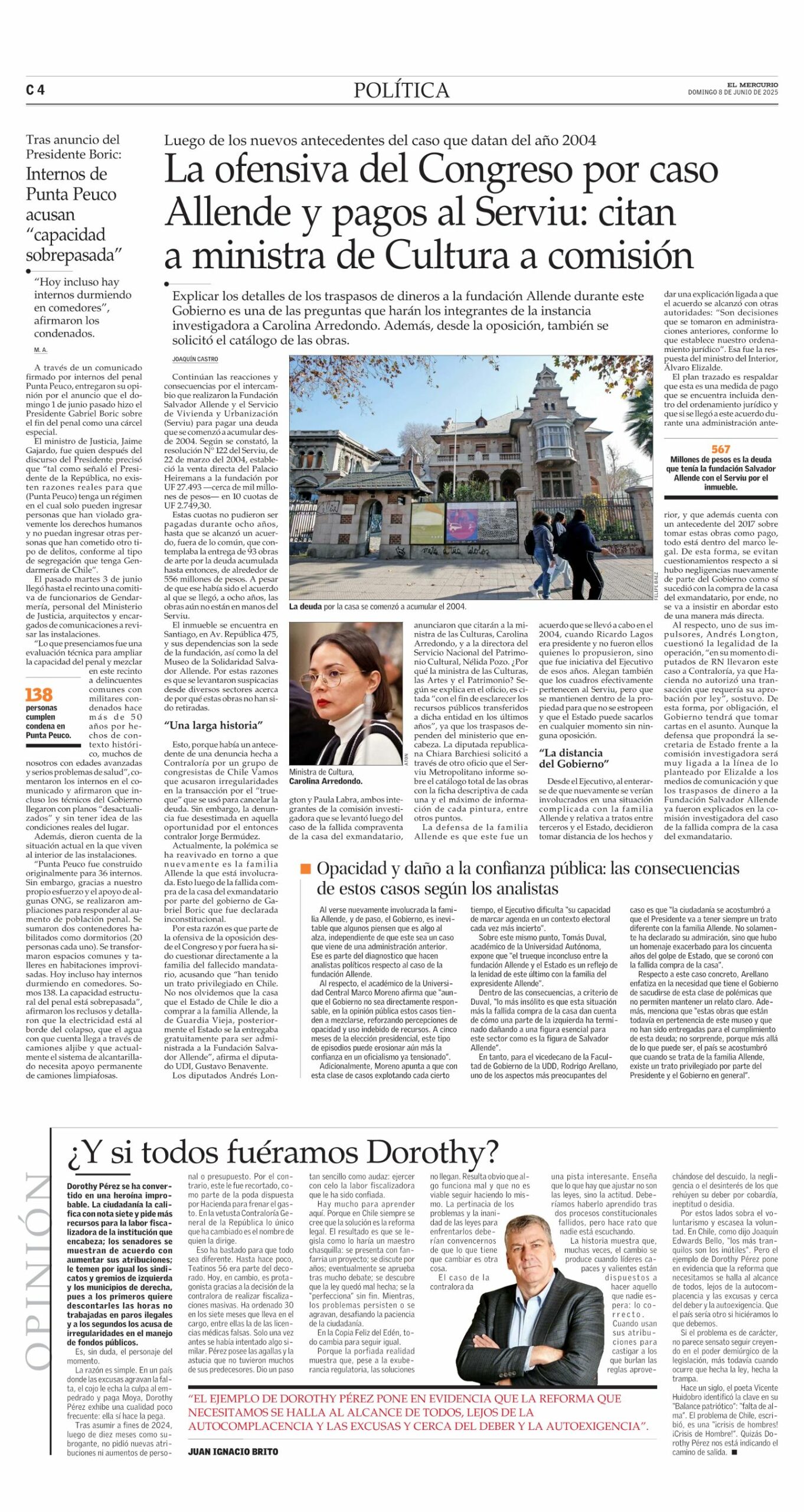 (…) En tanto, para el vicedecano de la Facultad de Gobierno de la UDD, Rodrigo Arellano, uno de los aspectos más preocupantes del caso es que “la ciudadanía se acostumbró a que el Presidente va a tener siempre un trato diferente con la familia Allende. No solamente ha declarado su admiración, sino que hubo un homenaje exacerbado para los cincuenta años del golpe de Estado, que se coronó con la fallida compra de la casa”.