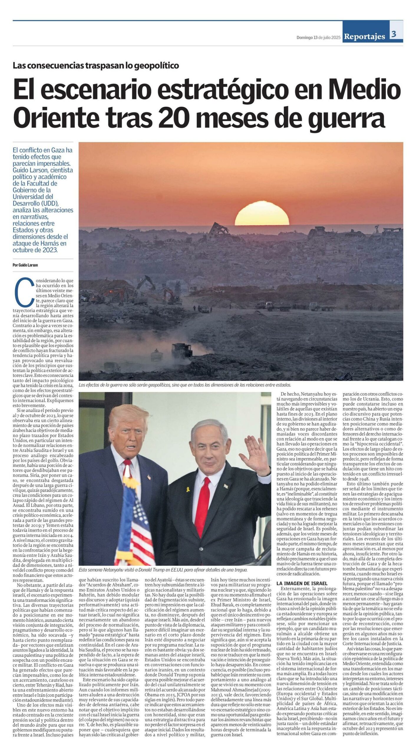 El conflicto en Gaza ha tenido efectos que parecían impensables. Guido Larson, cientista político y académico de la Facultad de Gobierno de la Universidad del Desarrollo (UDD), analiza las alteraciones en narrativas, relaciones entre Estados y otras dimensiones desde el ataque de Hamás en octubre de 2023.