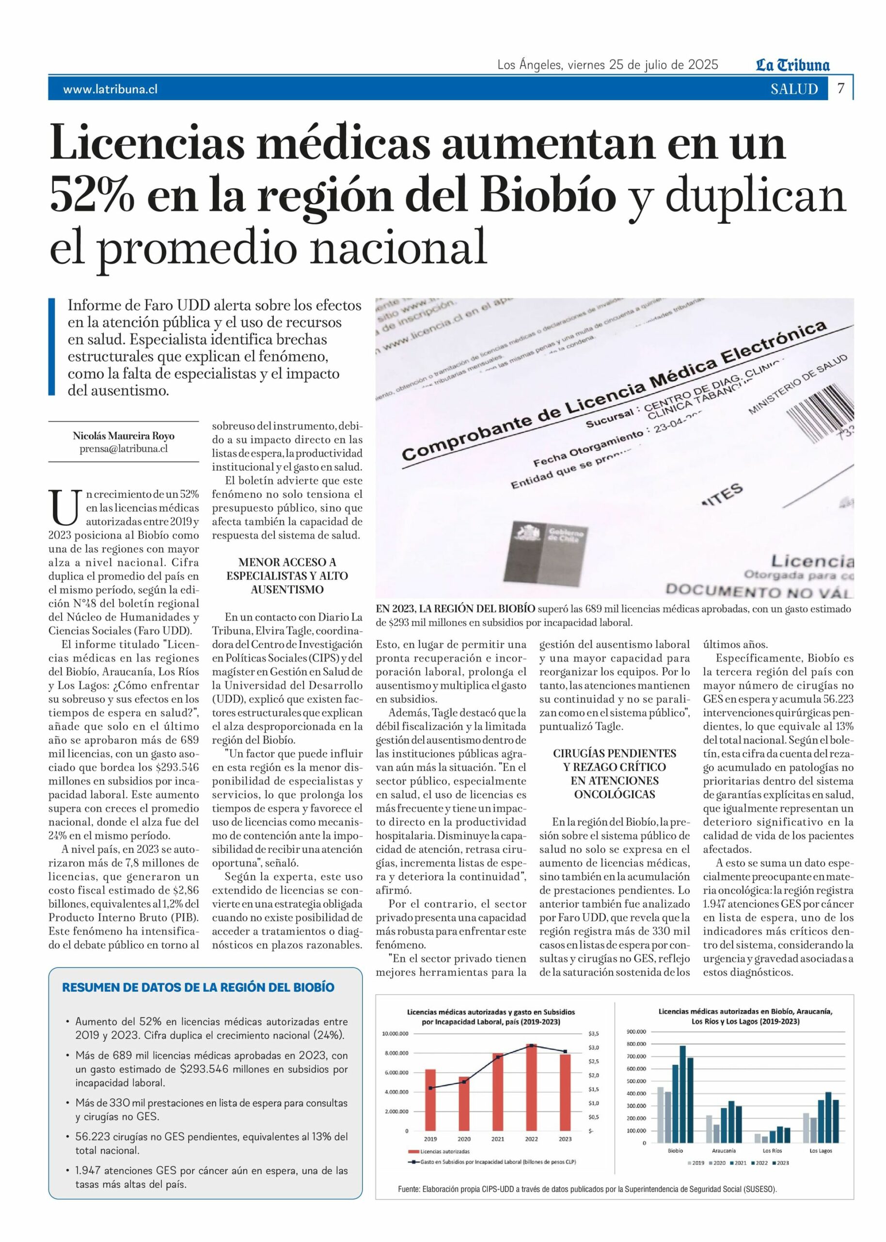 El informe titulado «Licencias médicas en las regiones del Biobío, Araucanía, Los Ríos y Los Lagos: ¿Cómo enfrentar su sobreuso y sus efectos en los tiempos de espera en salud?”, añade que solo en el último año se aprobaron más de 689 mil licencias, con un gasto asociado que bordea los $293.546 millones en subsidios por incapacidad laboral. Este aumento supera con creces el promedio nacional, donde el alza fue del 24% en el mismo período. A nivel país, en 2023 se autorizaron más de 7,8 millones de licencias, que generaron un costo fiscal estimado de $2,86 billones, equivalentes al1,2% del Producto Interno Bruto (PIB). Este fenómeno ha intensificado el debate público en torno al sobreuso del instrumento, debido a su impacto directo en las listas de espera, la productividad institucional y el gasto en salud.