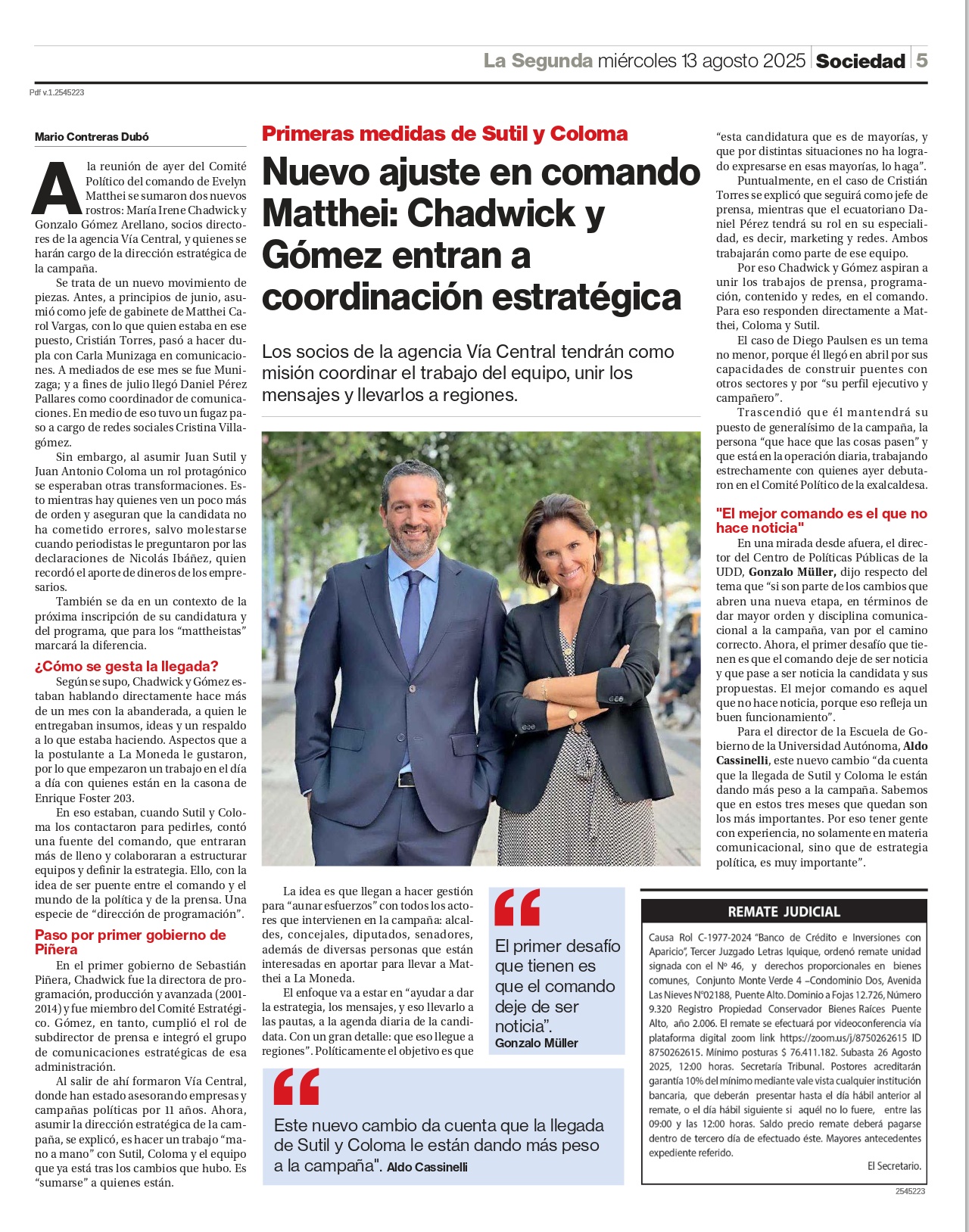 Se trata de un nuevo movimiento de piezas. Antes, a principios de junio, asumió como jefe de gabinete de Matthei Carol Vargas, con lo que quien estaba en ese puesto, Cristián Torres, pasó a hacer dupla con Carla Munizaga en comunicaciones. A mediados de ese mes se fue Munizaga; y a fines de julio llegó Daniel Pérez Pallares como coordinador de comunicaciones. En medio de eso tuvo un fugaz paso a cargo de redes sociales Cristina Villagómez.