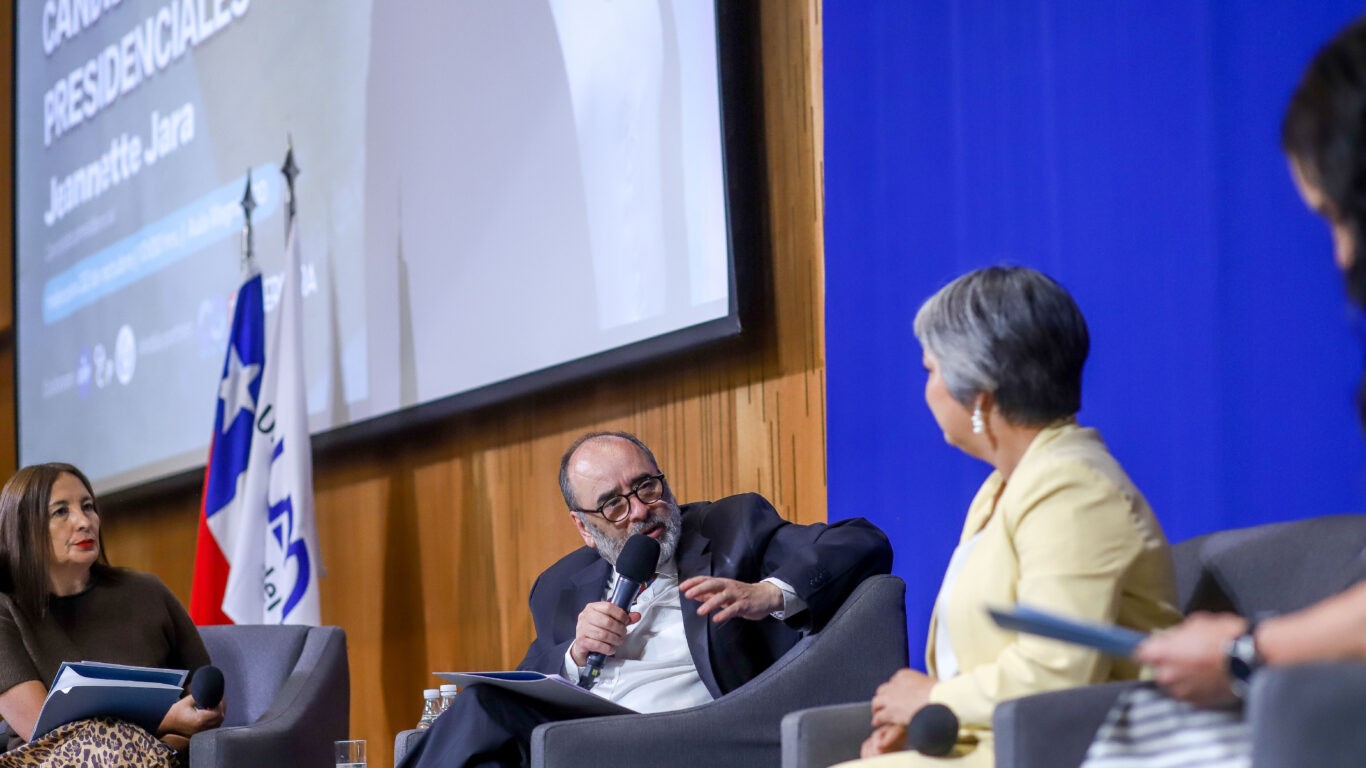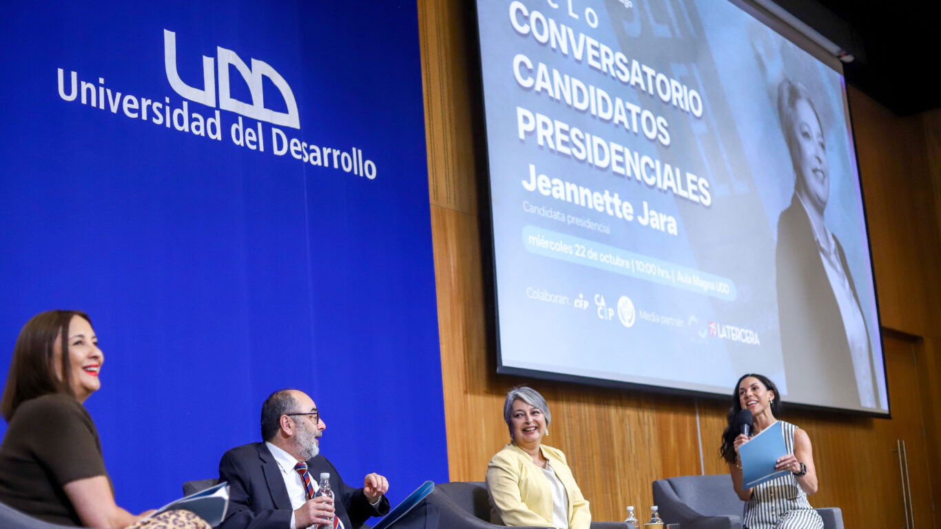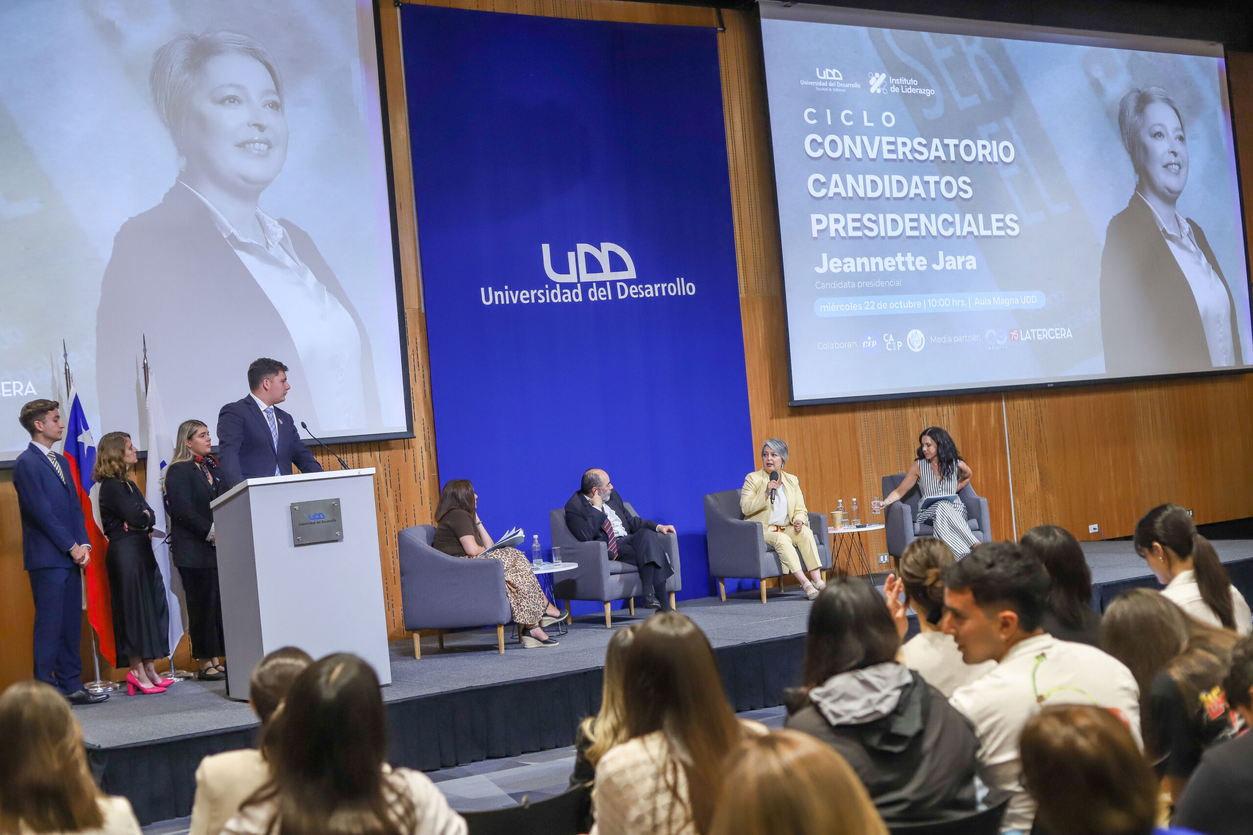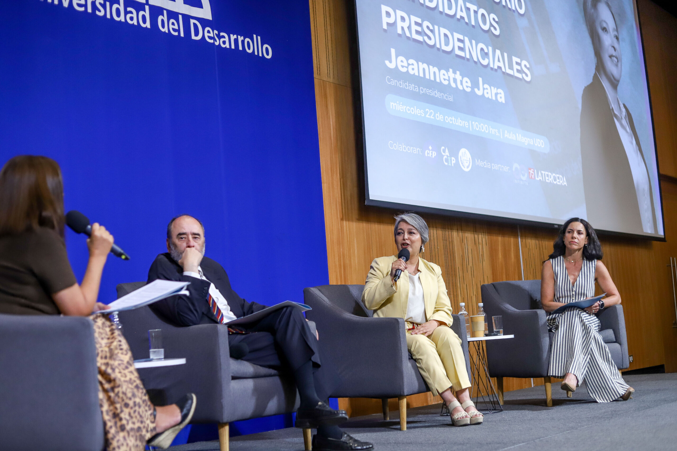 La exministra del Trabajo y Previsión Social, Jeannette Jara, participó este miércoles 22 de octubre en la segunda jornada de un ciclo de conversatorios con los aspirantes a La Moneda organizado por la Facultad de Gobierno UDD, donde la candidata abordó temas de seguridad, crecimiento económico, modernización del Estado y cohesión social.