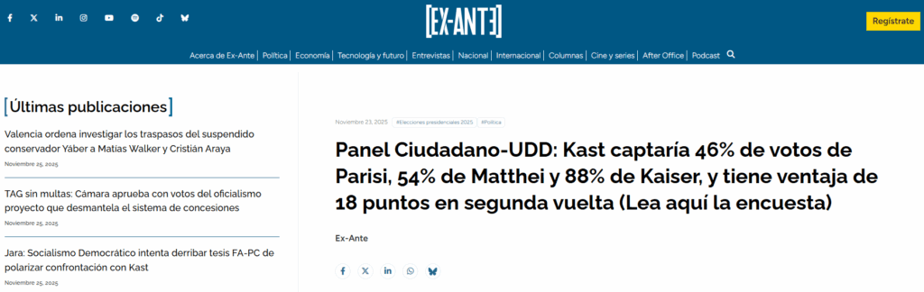 A tres semanas de la segunda vuelta presidencial, Panel Ciudadano-UDD reveló que José Antonio Kast logra captar gran parte del electorado de Franco Parisi (46%), Evelyn Matthei (54%) y Johannes Kaiser (88%). Jeannette Jara, en cambio, obtiene un 20% de los votos de Parisi, 17% de los de Matthei y solo el 4% de los de Kaiser. La encuesta proyecta que, si la elección fuera este domingo y sin considerar votos nulos y blancos, Kast obtendría un 59% frente al 41% de Jara. El estudio además muestra altos niveles de indecisión y rechazo, y sugiere que podría registrarse un récord de votos nulos como expresión de descontento político.