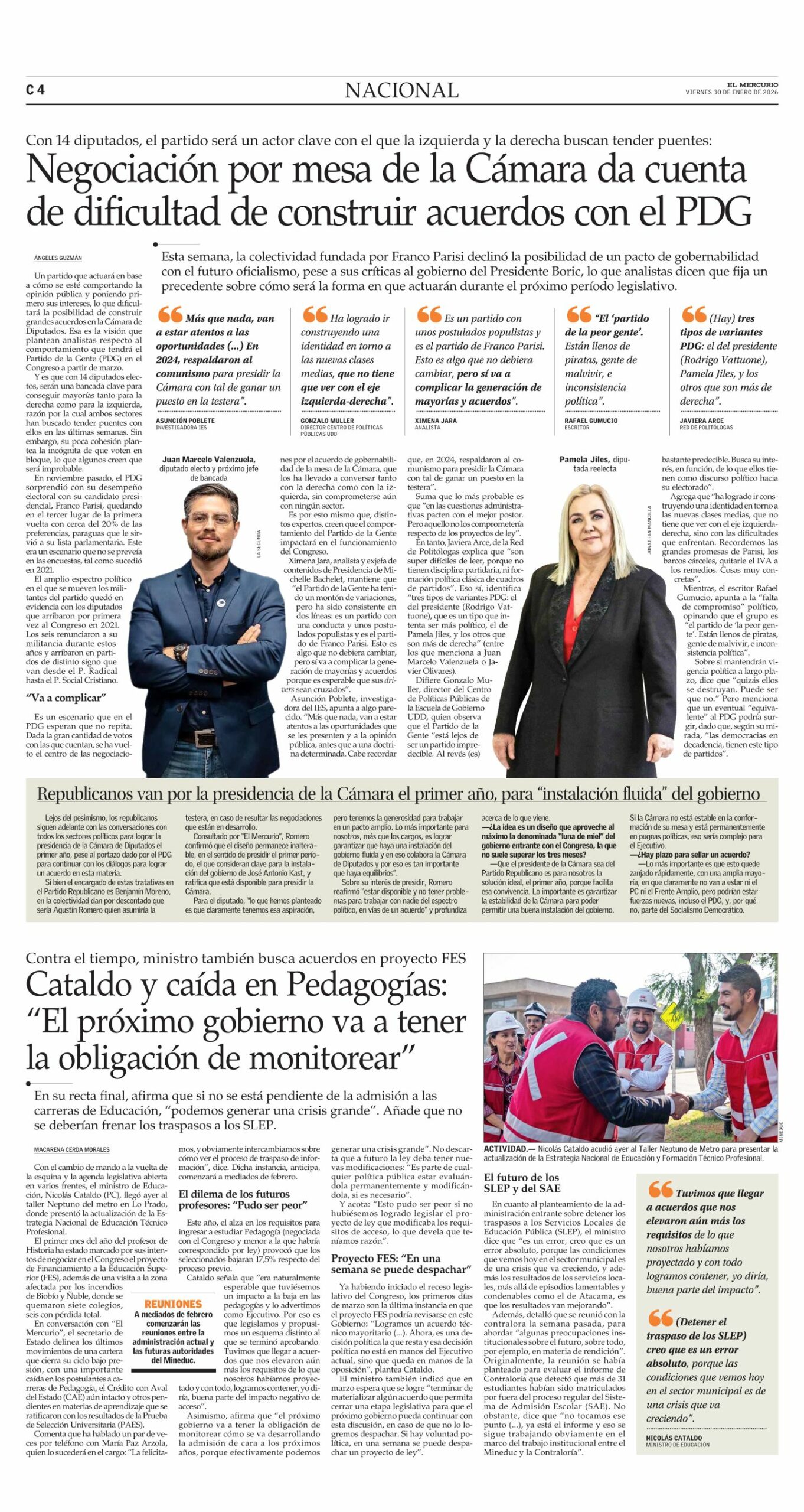 Un partido que actuará en base a cómo se esté comportando la opinión pública y poniendo primero sus intereses, lo que dificultará la posibilidad de construir grandes acuerdos en la Cámara de Diputados. Esa es la visión que plantean analistas respecto al comportamiento que tendrá el Partido de la Gente (PDG) en el Congreso a partir de marzo.