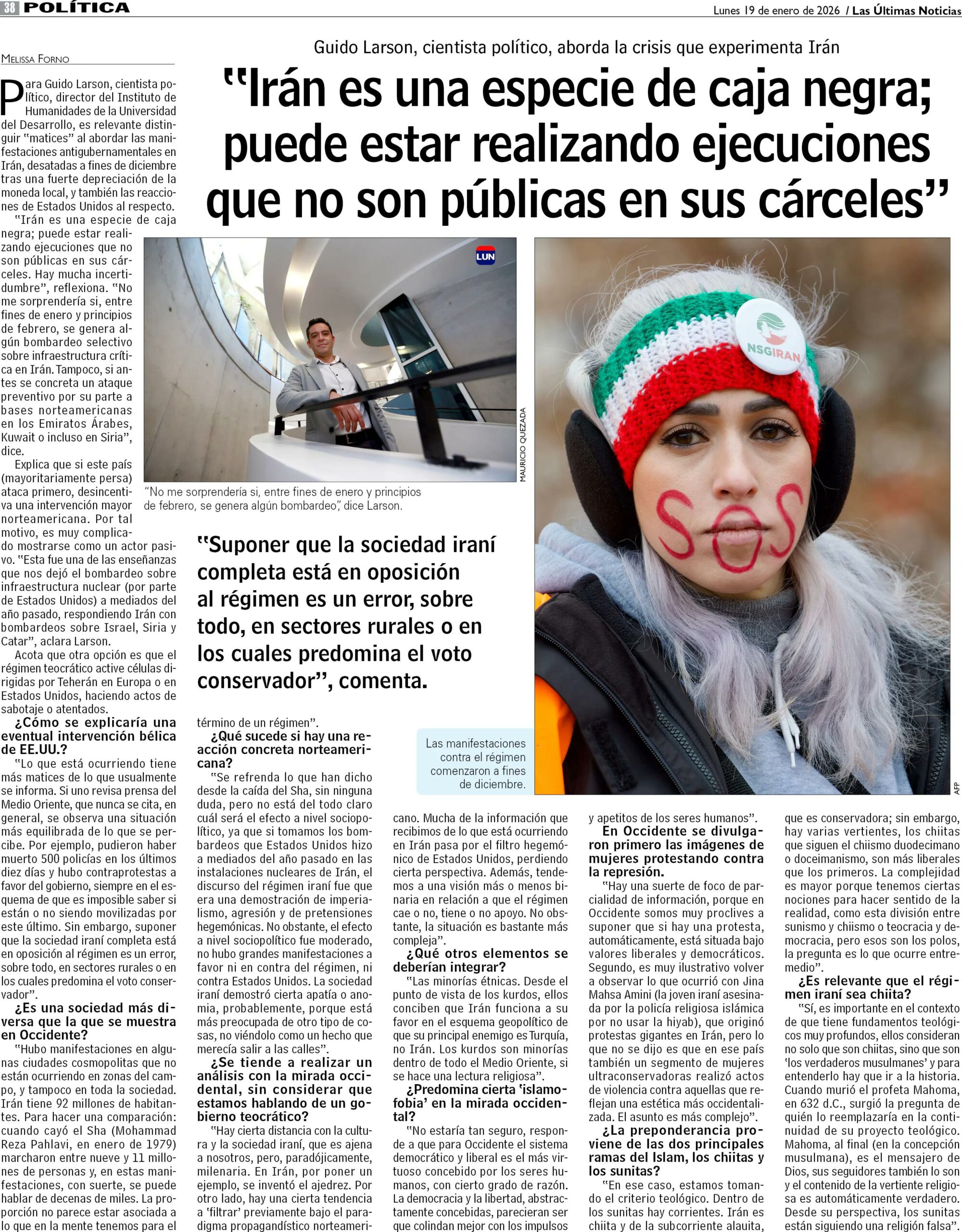 «Lo que está ocurriendo tiene más matices de lo que usualmente se informa. Si uno revisa prensa del Medio Oriente, que nunca se cita, en general, se observa una situación más equilibrada de lo que se percibe. Por ejemplo, pudieron haber muerto 500 policías en los últimos diez días y hubo contraprotestas a favor del gobierno, siempre en el esquema de que es imposible saber si están o no siendo movilizadas por este último. Sin embargo, suponer que la sociedad iraní completa está en oposición al régimen es un error, sobre todo, en sectores rurales o en los cuales predomina el voto conservador».