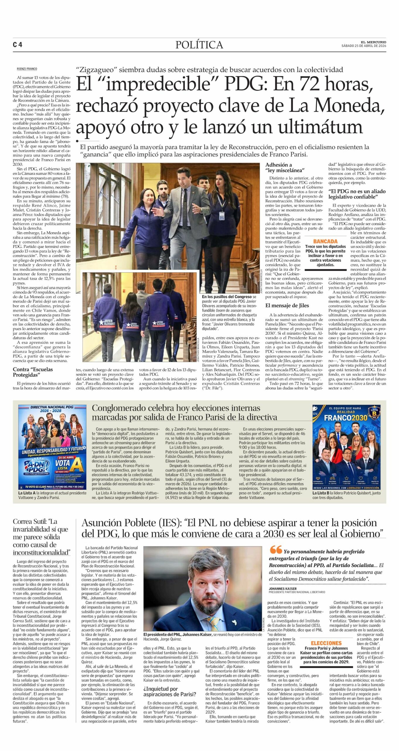A su juicio, “el comportamiento que ha tenido el PDG recientemente, entre apoyar la ley de Reconstrucción, rechazar ‘Escuelas Protegidas’ y que se establezca un ultimátum, confirma un patrón conocido en el PDG: que tiene alta volatilidad programática, no es un partido ideológico, y que es probable que asuma visiones caso a caso y que la proyección de la posible candidatura de Franco Parisi también tiene un fuerte incentivo a diferenciarse del Gobierno”.
