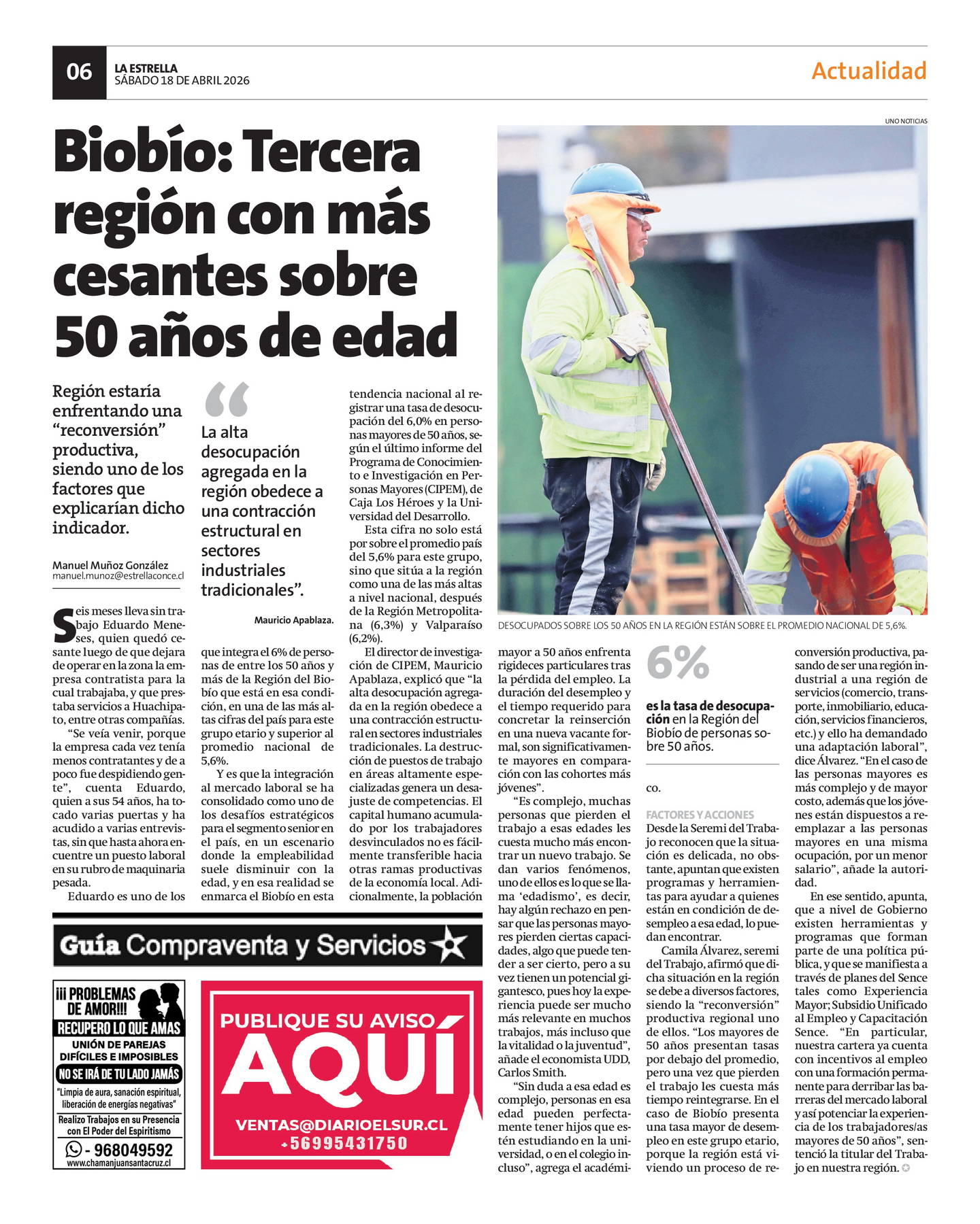 Y es que la integración al mercado laboral se ha consolidado como uno de los desafíos estratégicos para el segmento senior en el país, en un escenario donde la empleabilidad suele disminuir con la edad, y en esa realidad se enmarca el Biobío en esta tendencia nacional al registrar una tasa de desocupación del 6,0% en personas mayores de 50 años, según el último informe del Programa de Conocimiento e Investigación en Personas Mayores (CIPEM), de Caja Los Héroes y la Universidad del Desarrollo.